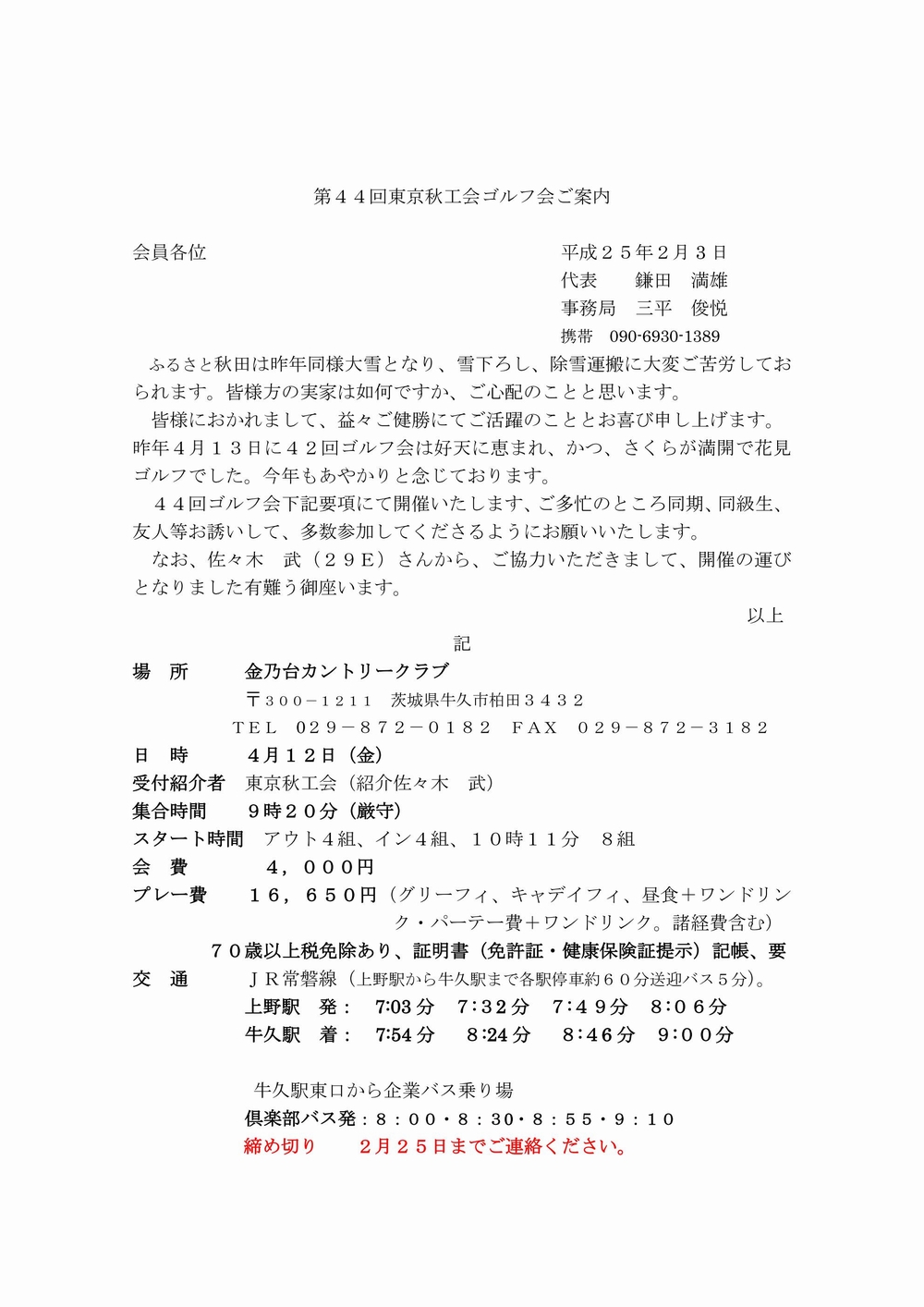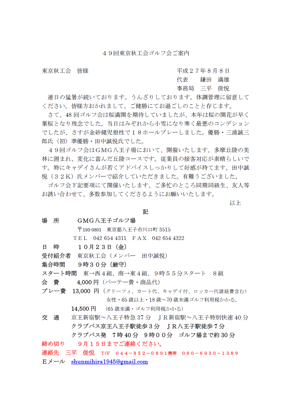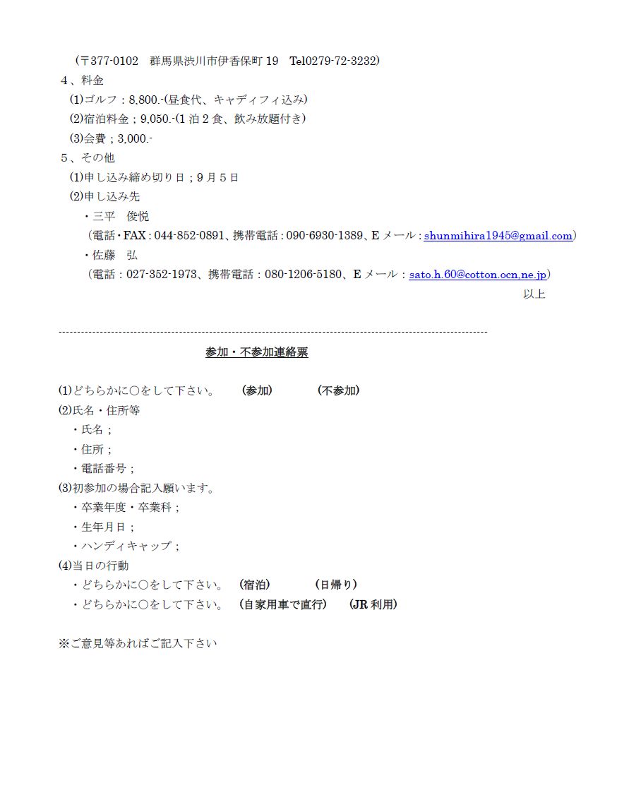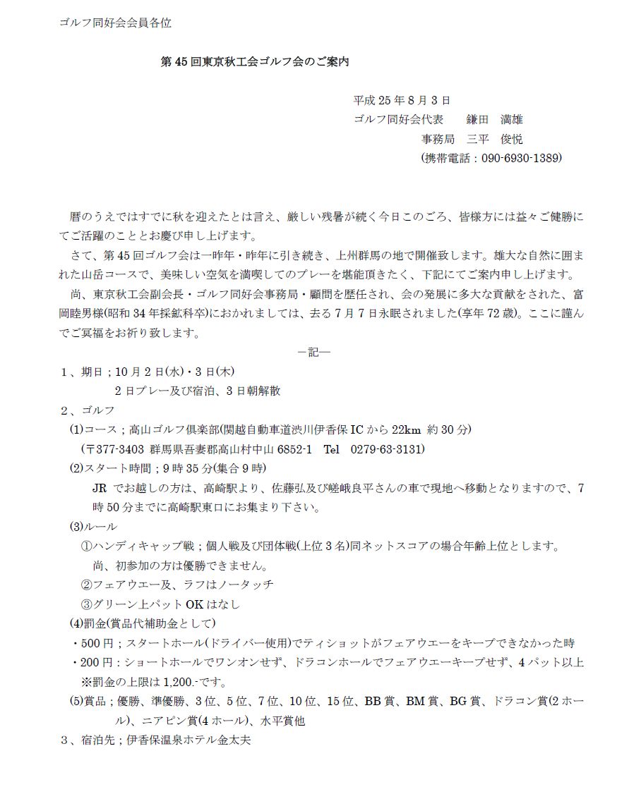 東京秋工会第47回ゴルフ会は合同参加といたします。皆様お誘い合わせてご参加お願いします。3月30日まで下記に連絡ください。