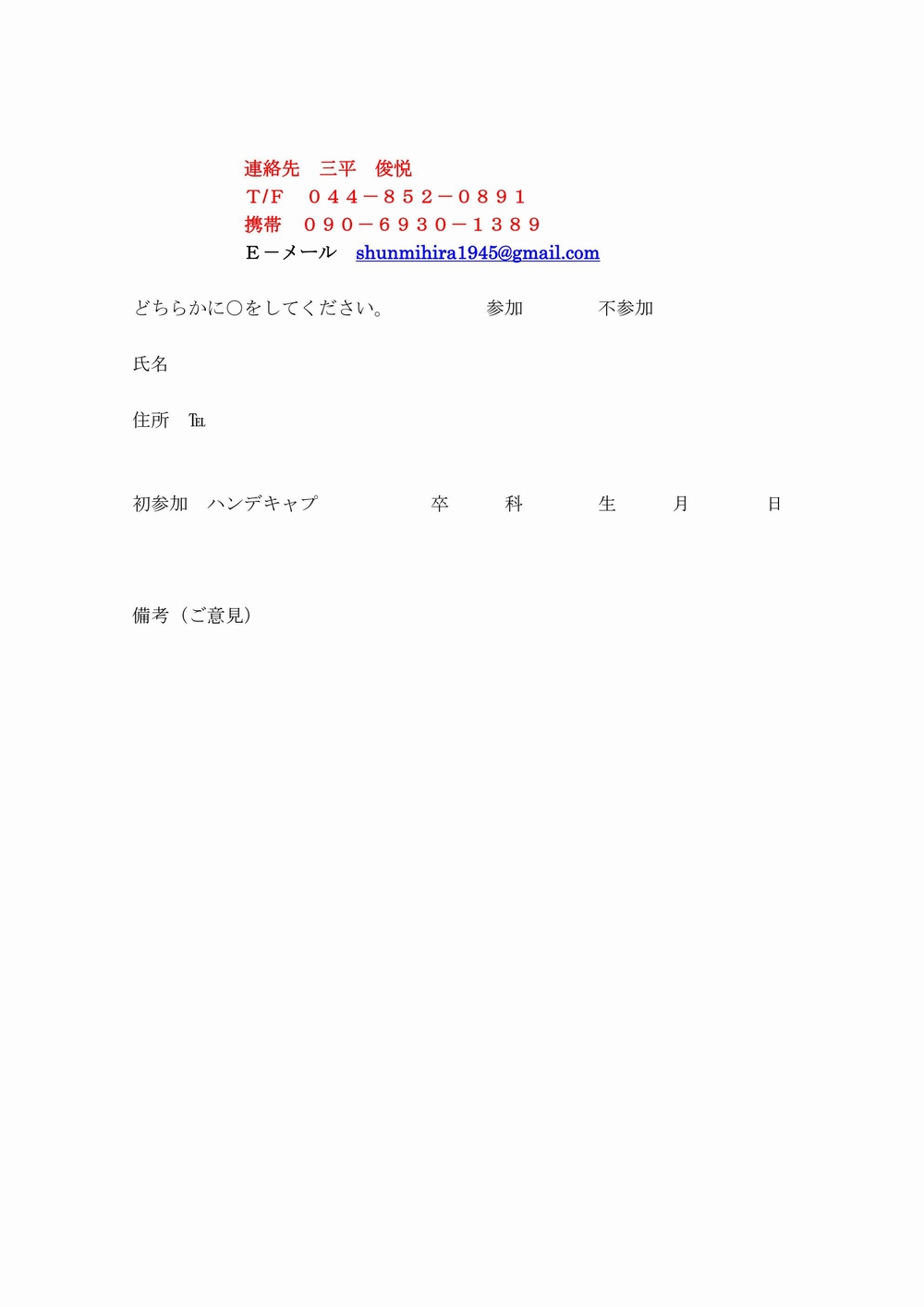 連絡先 三平 俊悦 T/F 044−852−0891携帯 090−6930−1389