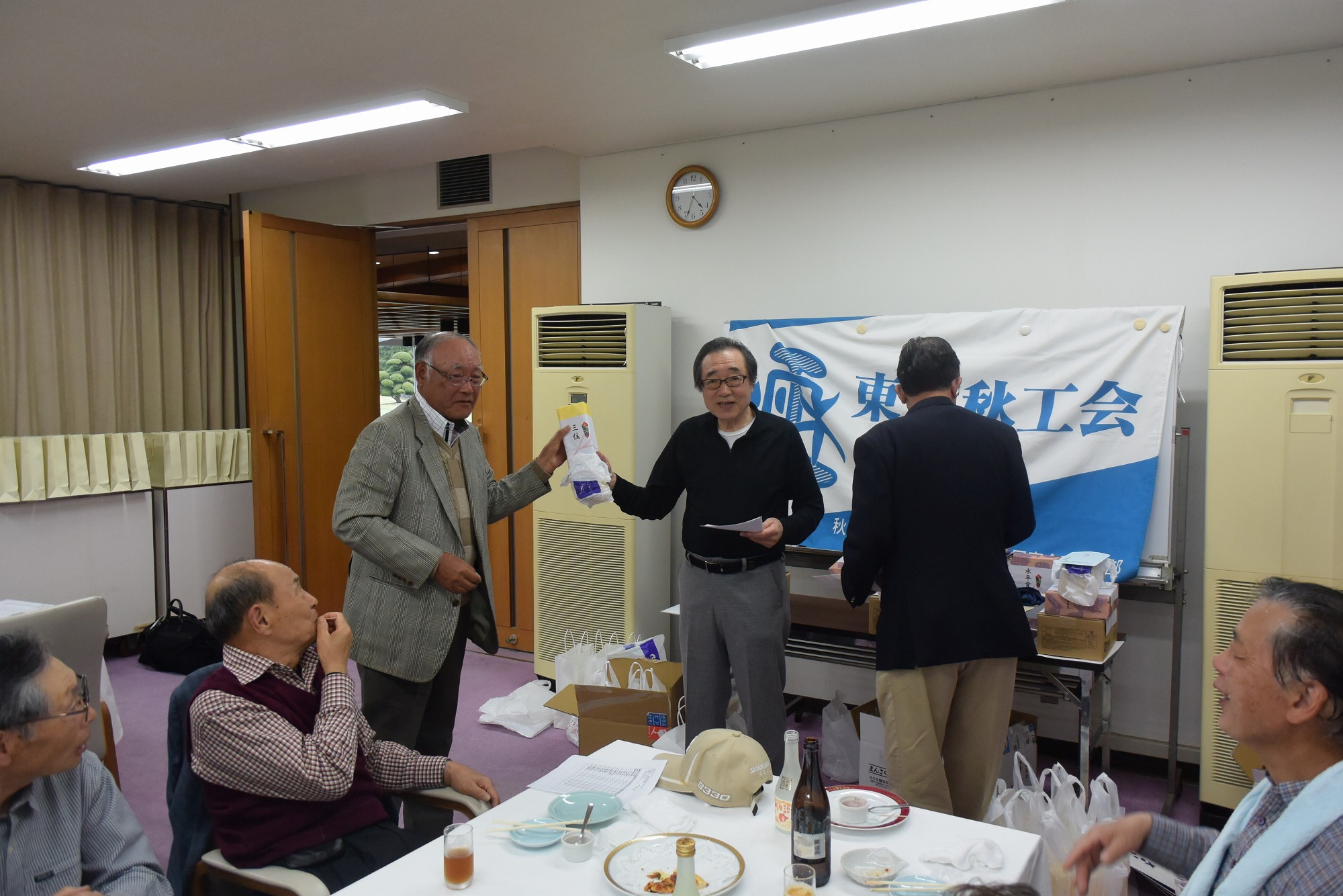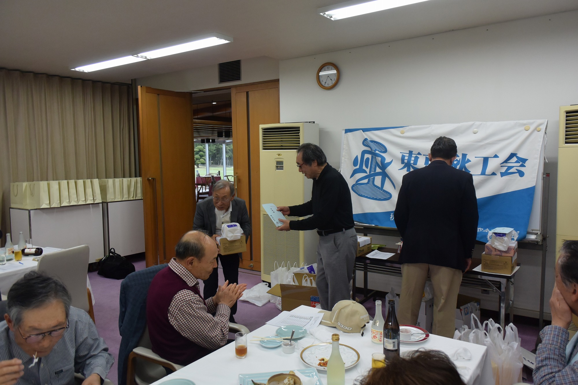 ホールアウト後、表彰式・懇親会では冒頭、嵯峨良平さん(43E)のフルートの演奏をバックに、秋工校歌、そして応援歌を声高らかに歌い、遠い昔の在校時代を偲びました。