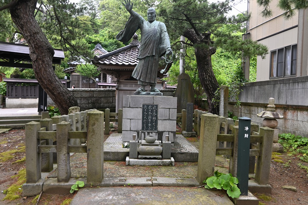 住吉屋ホテルの裏に日蓮上人獅子吼の説法銅像がありました。佐渡に配流される上人の大誓願を今日に伝える説法をしたとされる北国最初の霊地です。