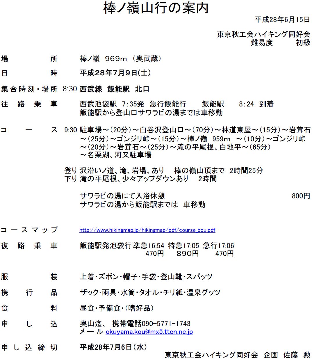 7月9日(土)の予定であった奥武蔵・棒ノ嶺山行は雨天のため、急遽7月12日(火)に変更し、佐藤勲(S40E)・市川正(S41E)・奥山恍(S41K)の3人でいどんだ。