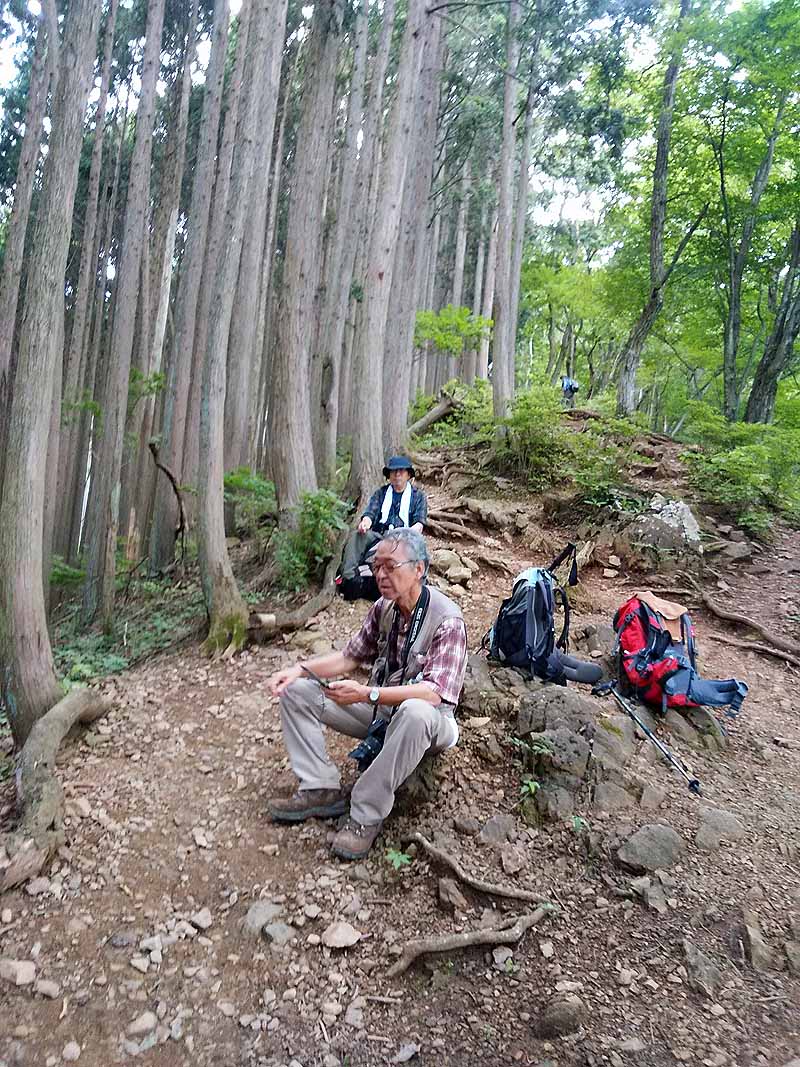 12:10分4回の休憩を含み3時間で969mの棒ノ嶺山頂に着いた。証拠写真を撮り弁当を広げたが蒸し暑さと疲れで食欲がでない、1時間ゆっくり休んで体力の回復を待ち13:15分下山開始、来た道を岩茸石まで戻り面白くもない杉林の道をただひたすらに下り16時待望のサワラビの湯で温泉に入り汗を流す、冷房のきいた畳の広間で小一時間過ごして帰途に就いた。