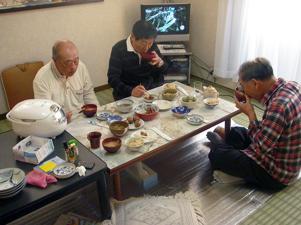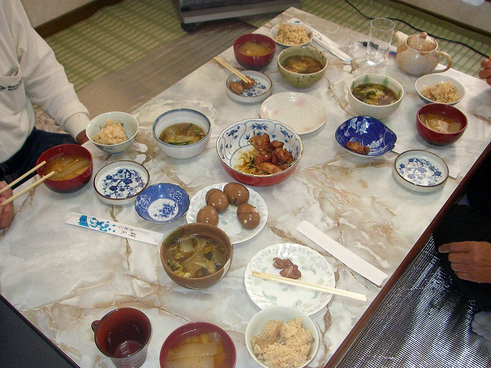 キリタンポ鍋で懇親 :佐藤弘氏(左)の料理に舌鼓