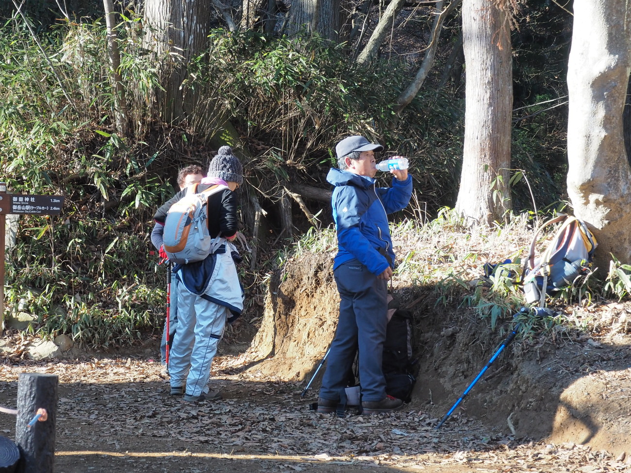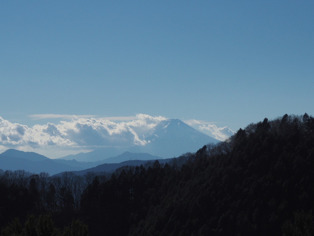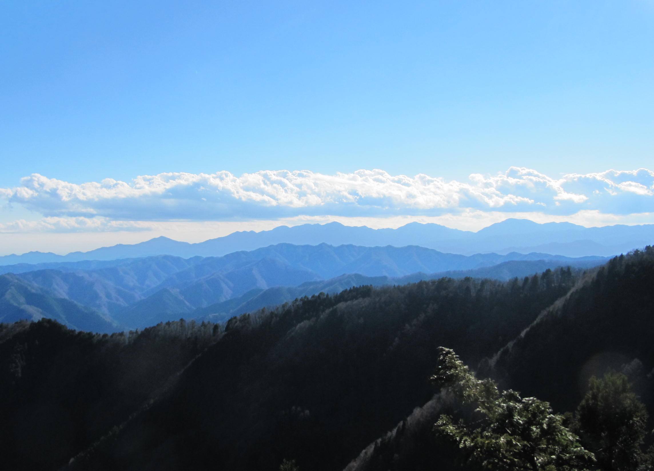 大岳の商店街を進み武蔵御嶽神社の登山口から10:00に登山開始、小さな祠のような奥の院をへて11:30目的の鍋割山到着、12:30大岳神社大鳥居の前にある展望台にて昼食休憩、高尾山系・丹沢山系のはるか西側の富士山の眺望は雄大であった。