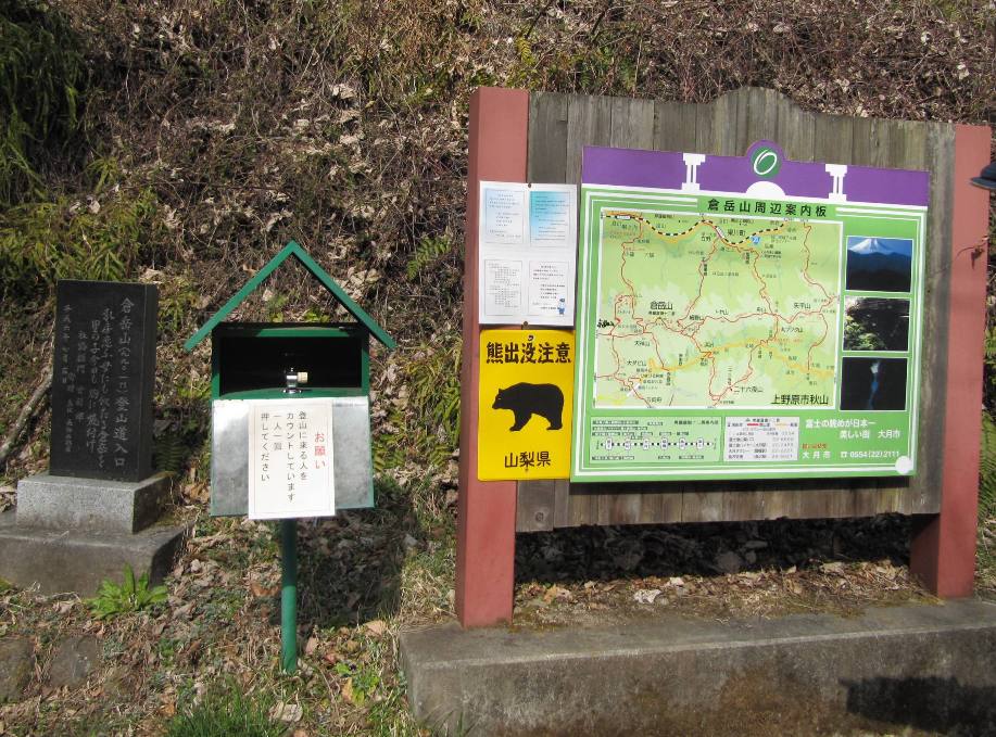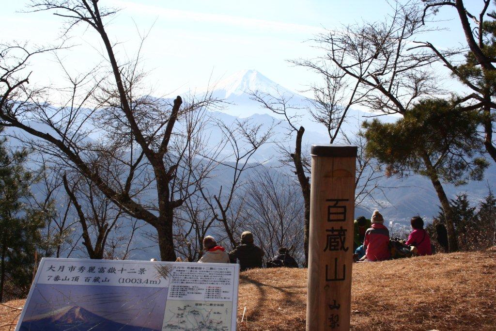 駅を出て右手前方の百蔵山と扇山を眺めながら桂川に架る橋を渡ると舗装された坂道を延々と30分進みようやく登山口の標識に出会う、左右に分かれているので、左手の道を選択(西側に富士山を望める)途中に3回の小休止をはさみ、12時15分山頂(1003m)に到着する。