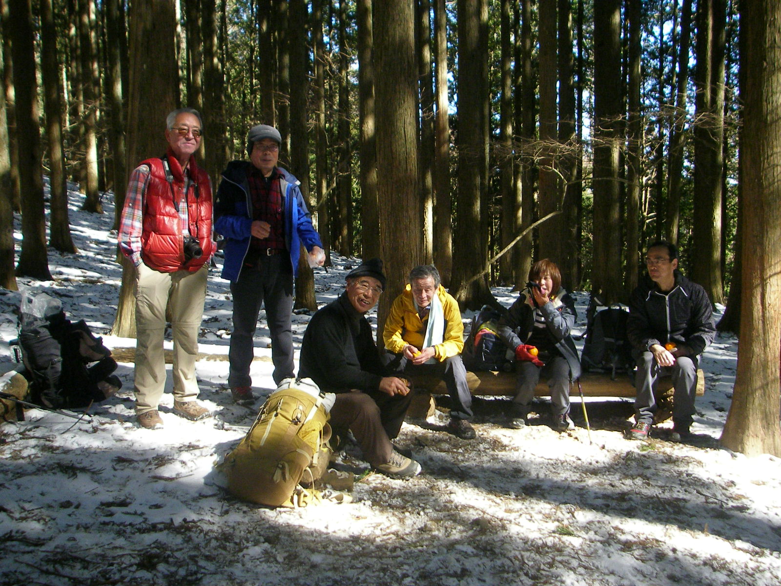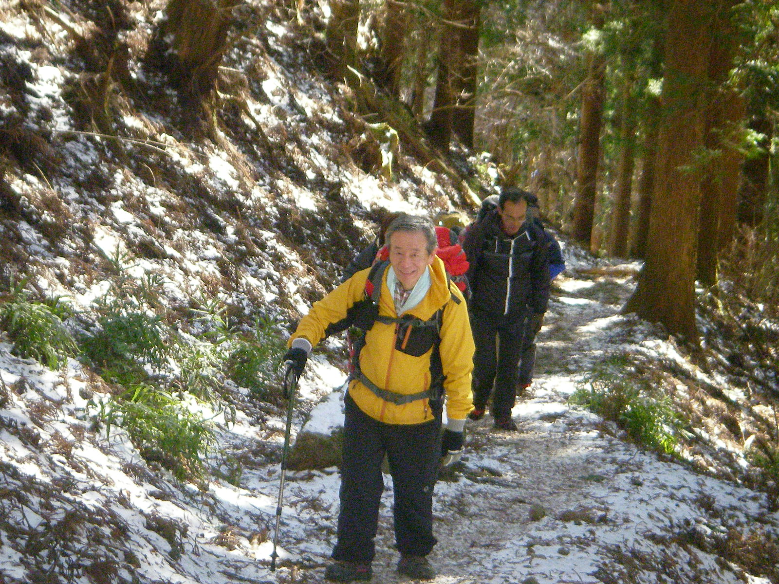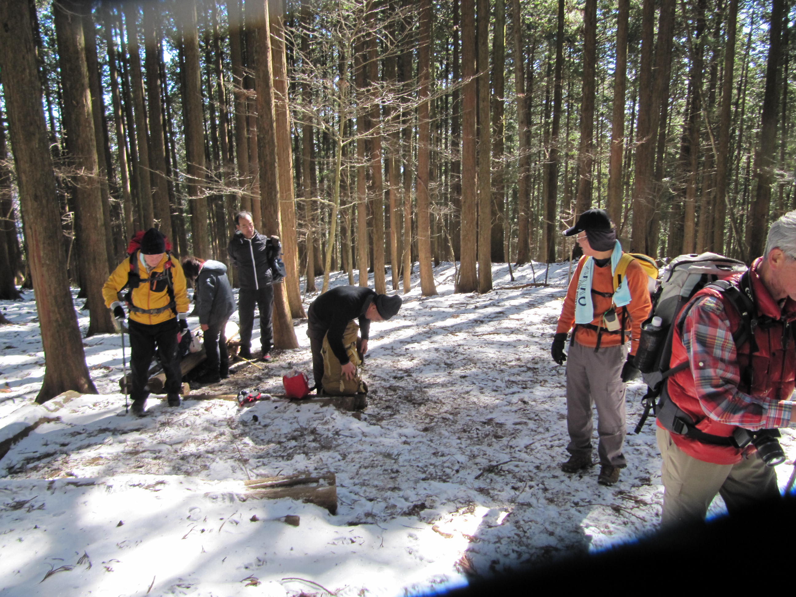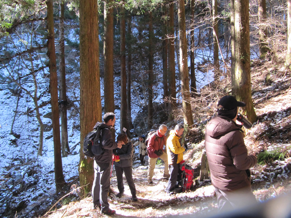 10時15分最初の小休止で着衣の調整をして不動滝で写真を撮り32丁目(1丁は90m)の先にある大杉の広場で2回目の休憩を取り思い思いに行動食で一息ついた、ここから先の九十九折の登山道は凍結していて下山してきた20人のグループに出会ったが全員アイゼンを履いていた。