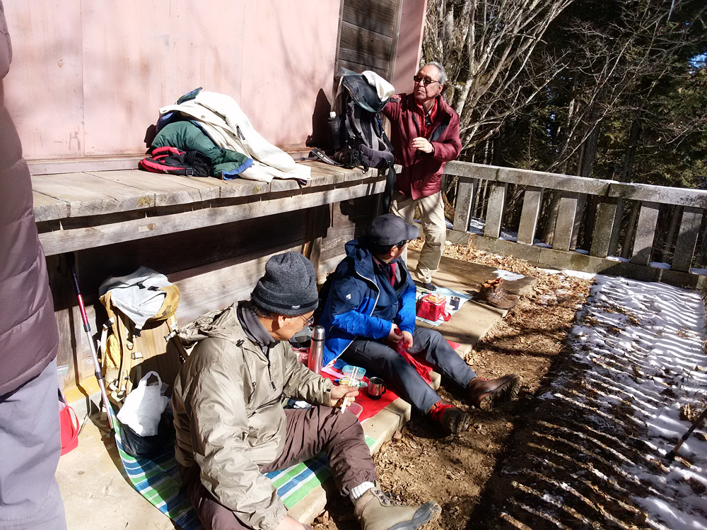 武蔵五日市駅に9:30集合し西東京バスで日の出山登山口下車つるつる温泉手前の三ツ沢分岐から20分程で旧新道分岐の不動尊に着く、ここで法螺貝を持った若者グループに会う(修験者には見えない)。やや急坂であるがジグザグの道を快調に進み顎掛岩・クロモ岩を経て標高800mで残り1.2Kmで3回目の休憩、この後急な階段を30分程登り902mの山頂到着ほぼ計画通りの11時40分登頂であった。