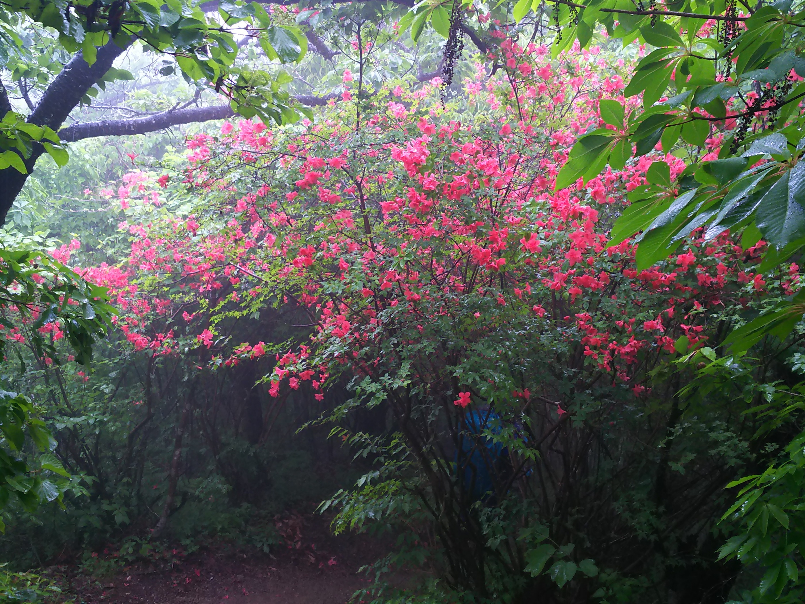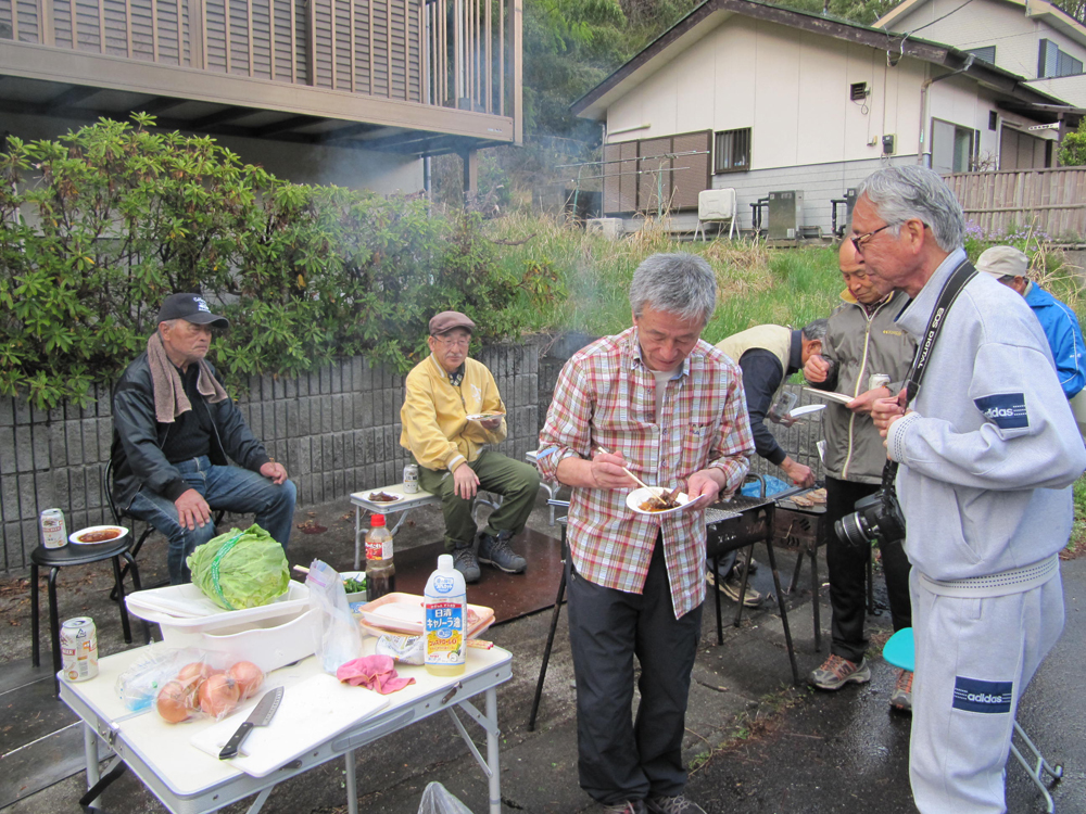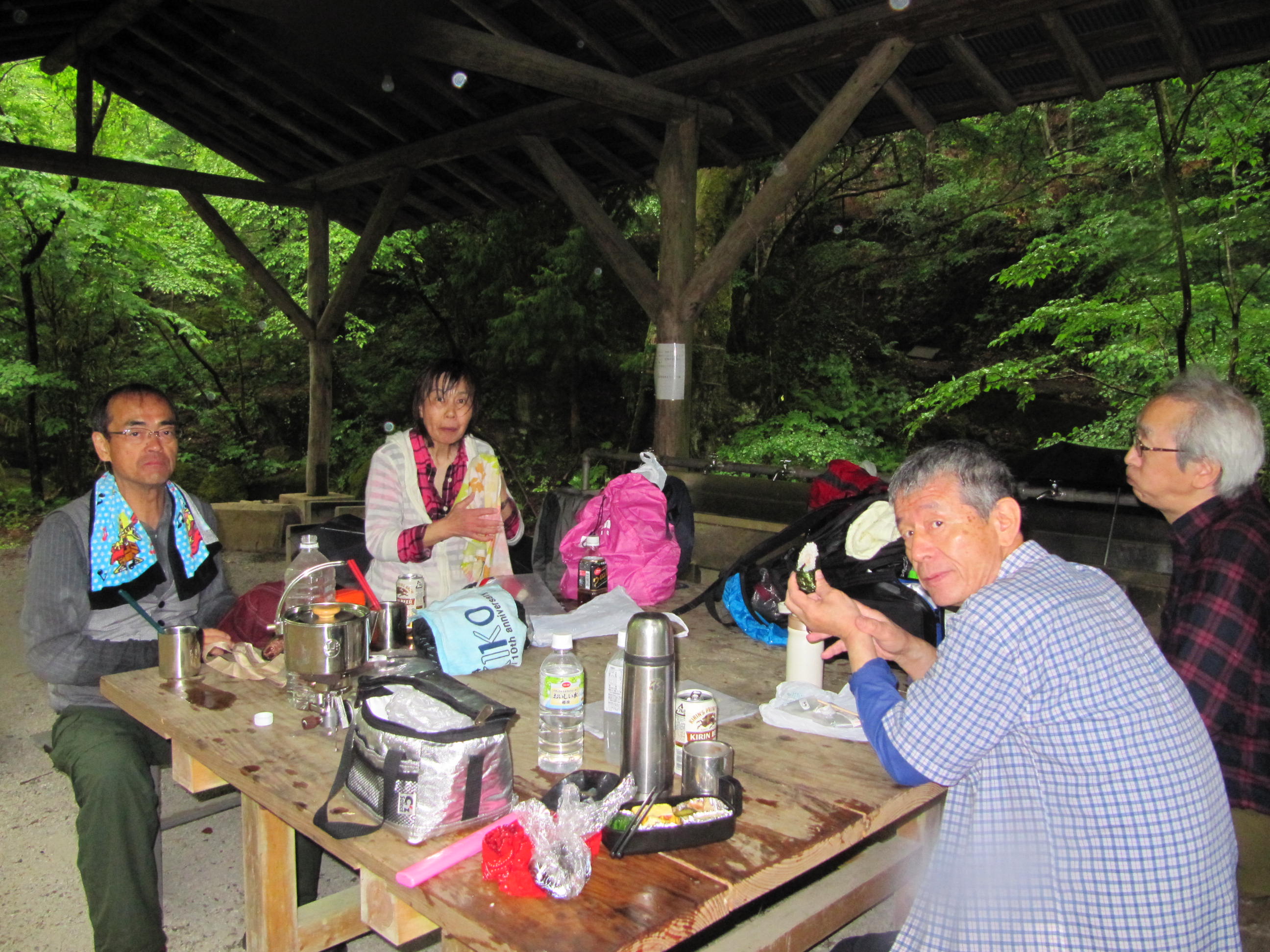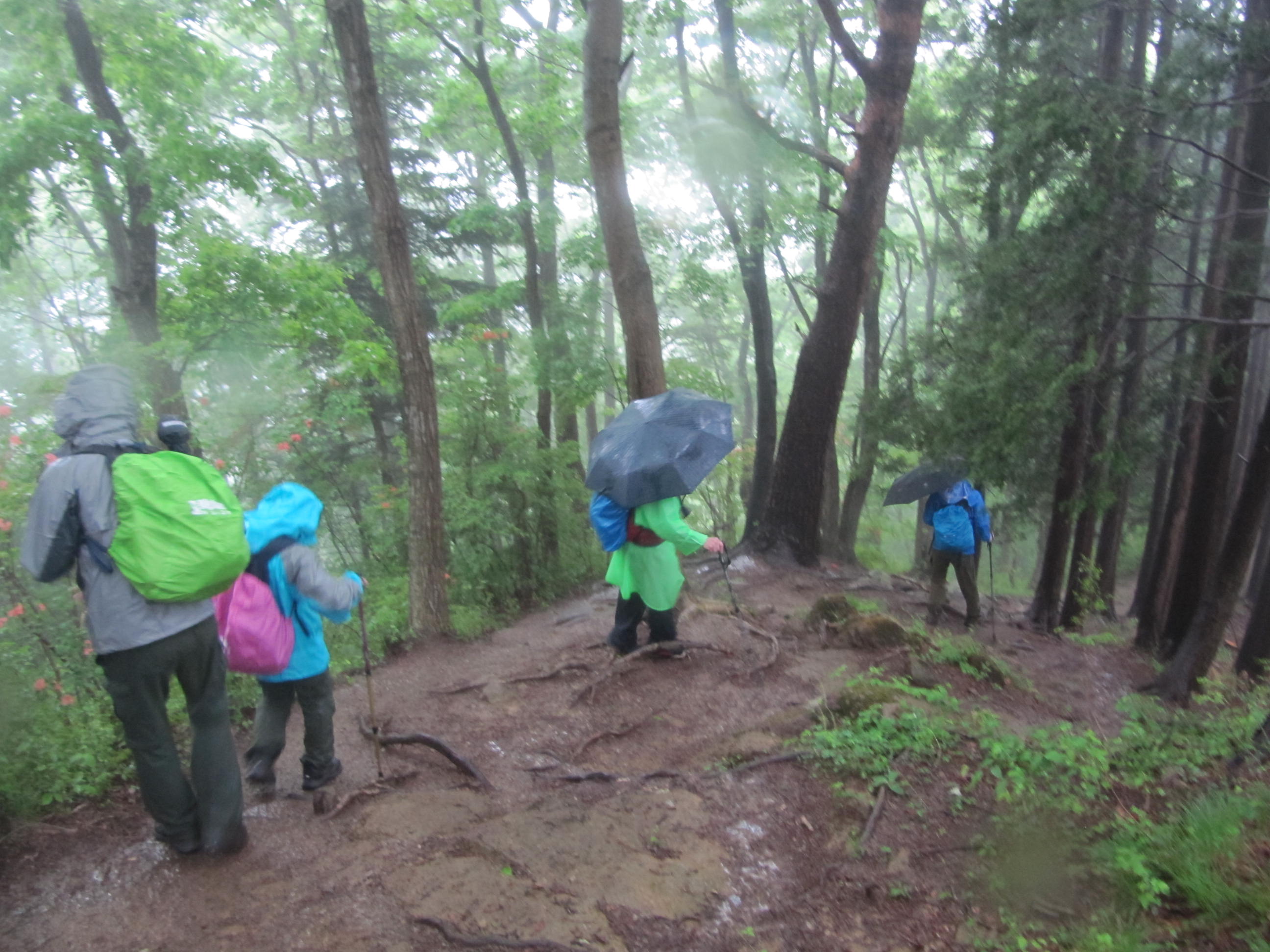 取りあえず証拠写真を撮り各自おにぎりを1個だけ傘をさしながら食べ早々に下山開始、すぐに見事なヤマツツジのトンネルを眺めながら進むが登りとは比べものにならない急坂で岩場も多く滑らないように慎重に歩を運んだ。 2時間程でバンガローに付帯する炊事場らしき建物を拝借し遅い昼食を済ませてほっと一息、最初から最後まで雨中山行でした。