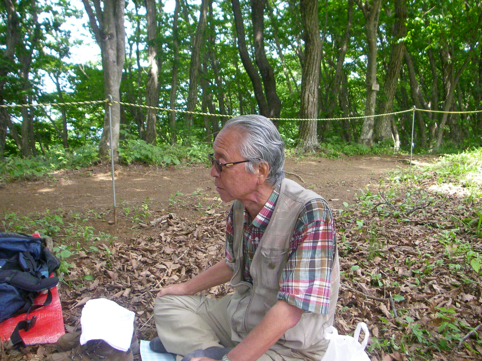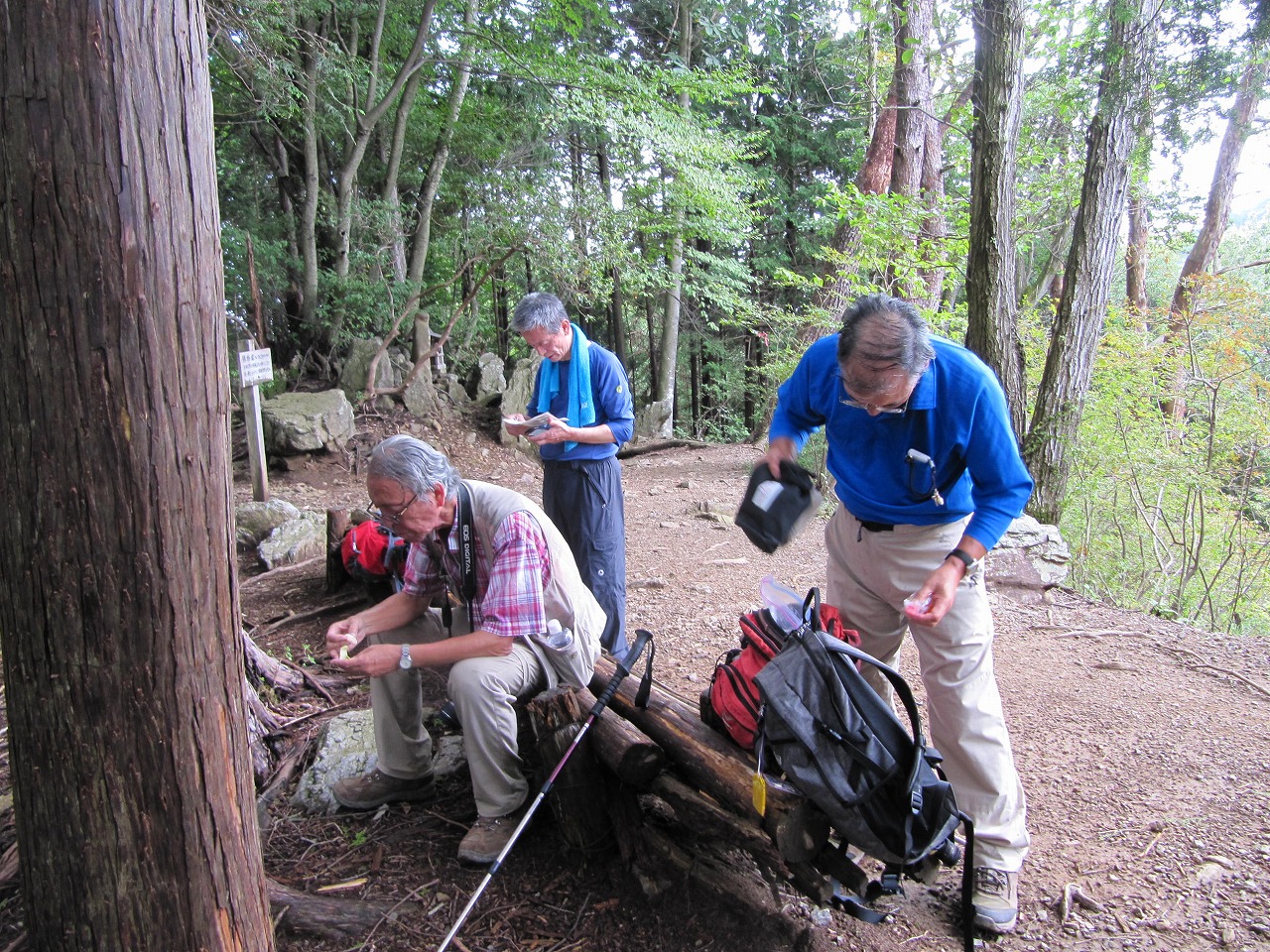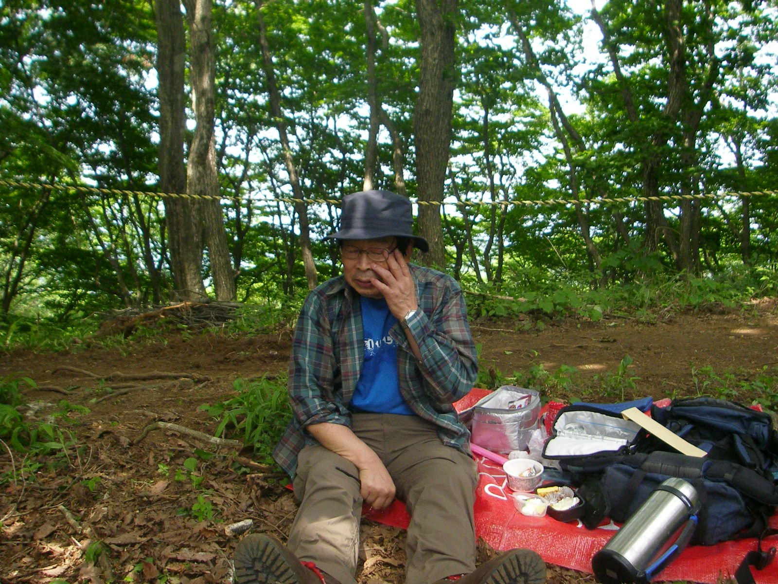 取りあえず証拠写真を撮り各自おにぎりを1個だけ傘をさしながら食べ早々に下山開始、すぐに見事なヤマツツジのトンネルを眺めながら進むが登りとは比べものにならない急坂で岩場も多く滑らないように慎重に歩を運んだ。 2時間程でバンガローに付帯する炊事場らしき建物を拝借し遅い昼食を済ませてほっと一息、最初から最後まで雨中山行でした。