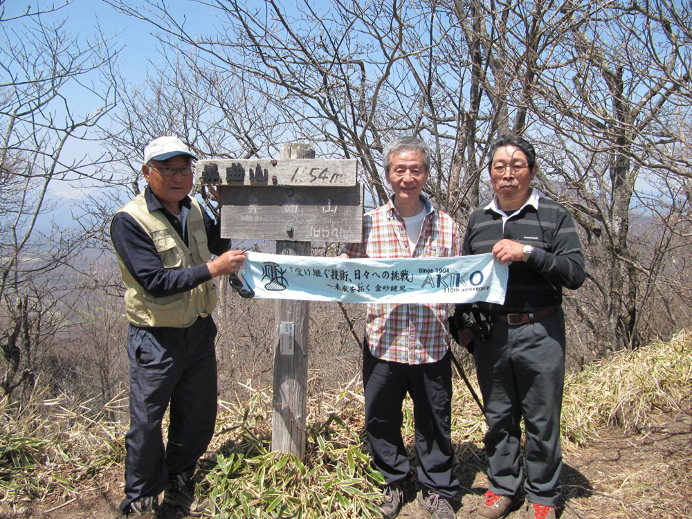 天気は最高!浅間山をバックに集合写真を1枚パチリ。8時55分出発。急緩入り混じったアップダウンを 繰り返し岩越えもありました。途中のピークの一つ、氷妻山10時到着。ここから急坂を下り笹藪を通り、 一転急登の連続となり山頂(1654m)に着く。11時30分でした。