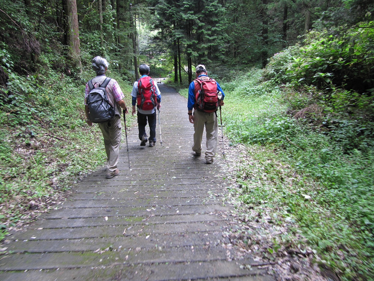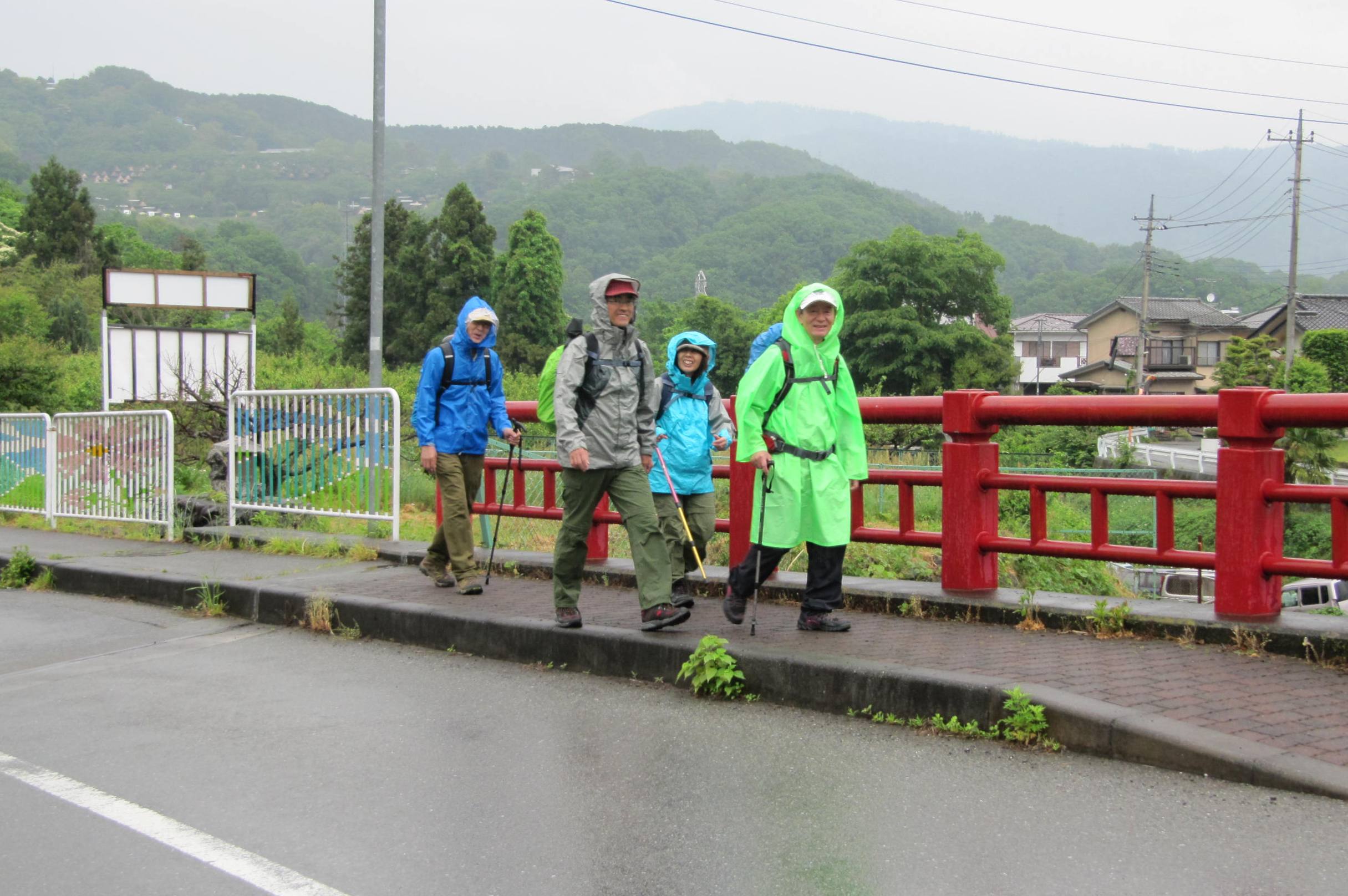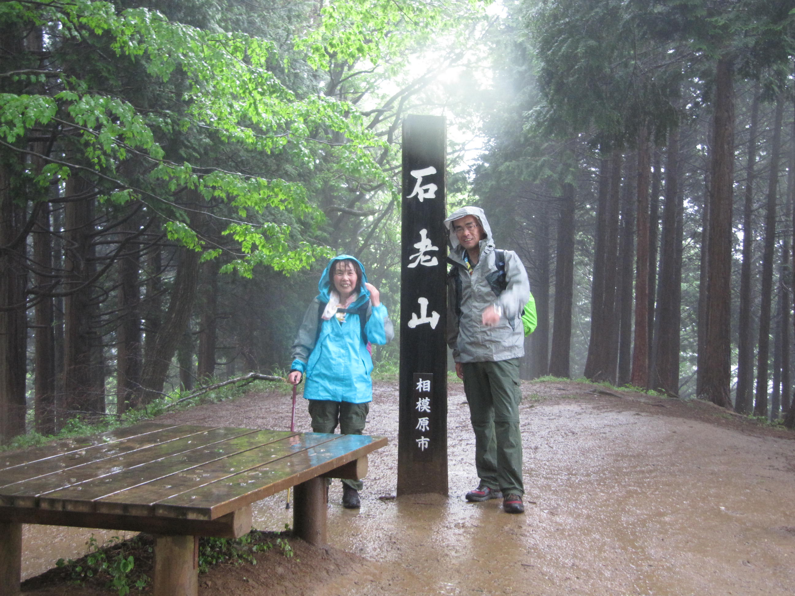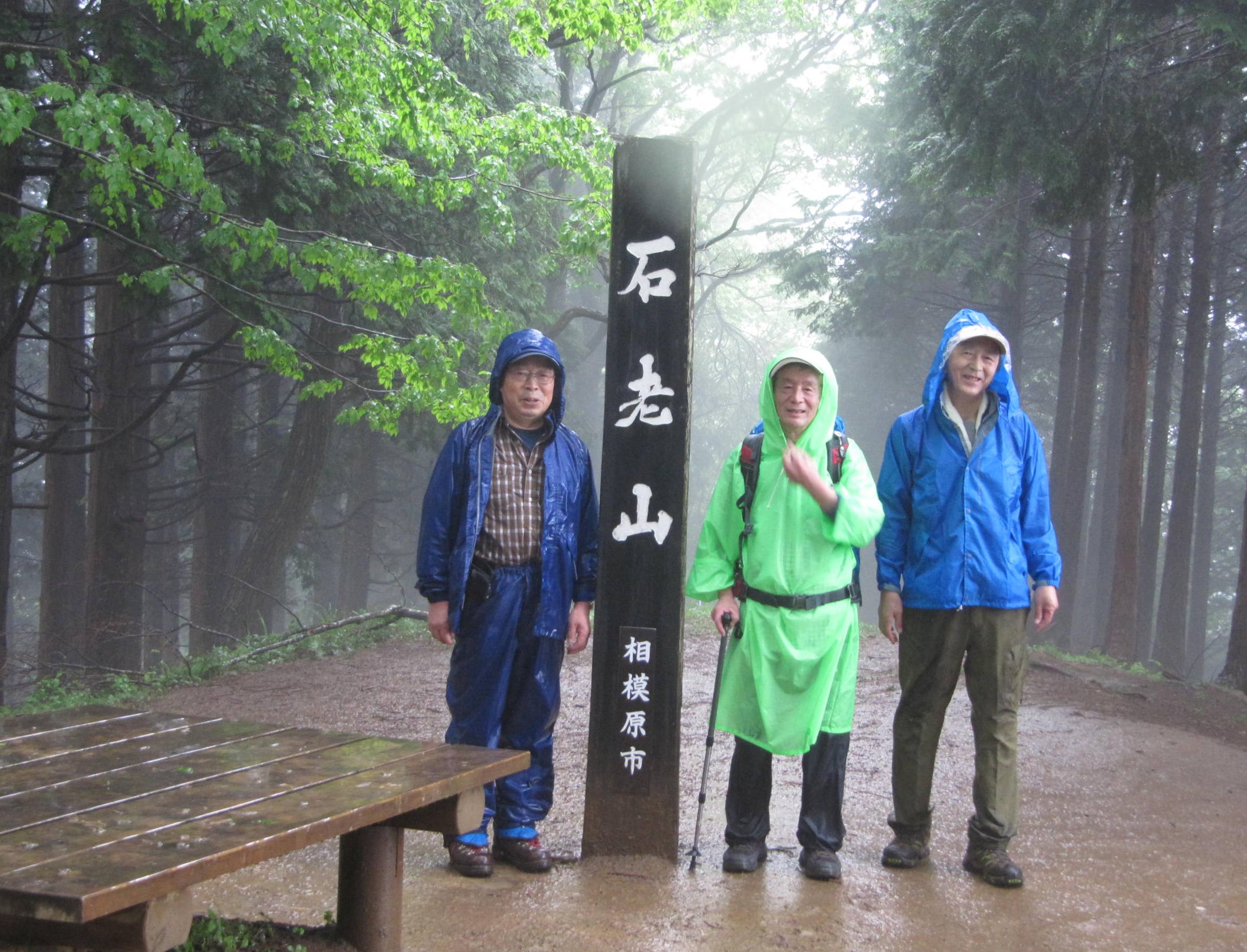 降水確率100%のこの日登山口へ向かうバスの中で雨具の支度をし降車後相模湖病院の裏手の登山道から顕鏡寺山門まで進み、最初の休憩を取り融合平見晴台を目指す、 徐々に雨脚が強くなり皆黙々と山頂への道を進む幸いなことにさほどの急こう配もなく山慣れしたメンバーであったので予定の時間より早く登頂できた。