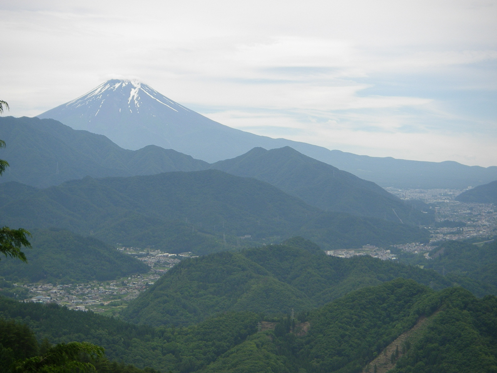 前日の雨でしばらくは悪路の狭い登山道を進み40分で分岐に出る、さらに30分進んだら「天狗岩 眺めがよい」との表示があったので誘われて5分行くと富士山がくっきり眼下に都留市の街並みがあり、なるほど良い眺めでした。