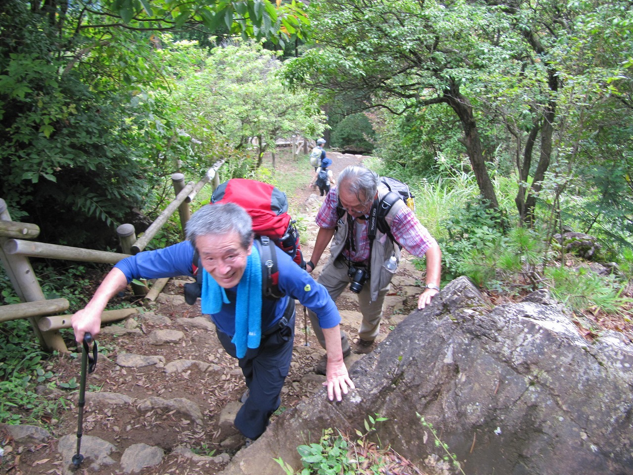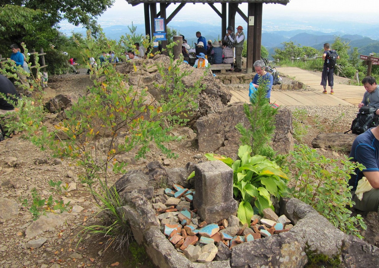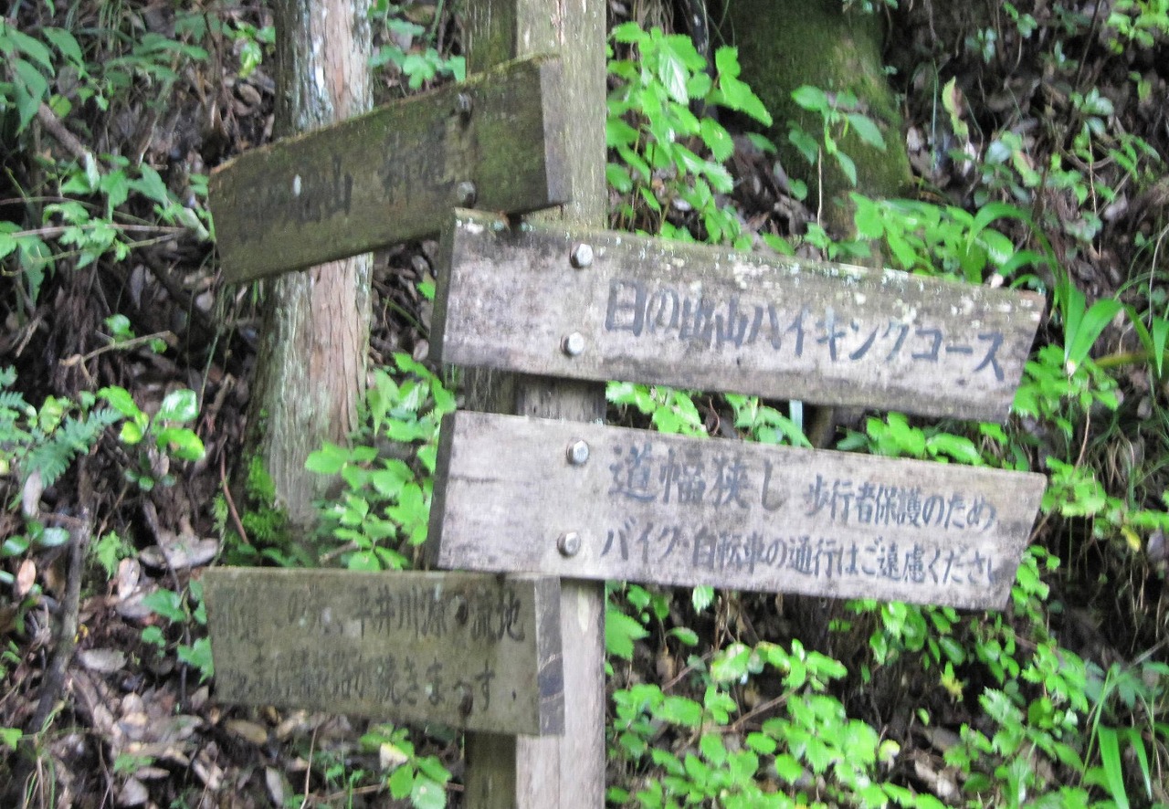 初狩駅は無人駅で出ると自販機が2台、1台は故障中でした。付近にはお店らしきものもなく民家が立ち並ぶ静かなる長閑な土地です。線路沿いに右手に進みガードをくぐると緩やか坂道沿いに広い墓地にでる。30分で登山口の道標があり、沢コースと男坂・女坂の分岐にでた、更に15分登り男坂を進むが勾配が急になりジグザグの歩行で細い木々の雑木林の急坂を他のハイカーを抜きつ抜かれつして、女坂との合流に着くと下で別れた2人組とであう、つまりは同じ時間を要したのです。