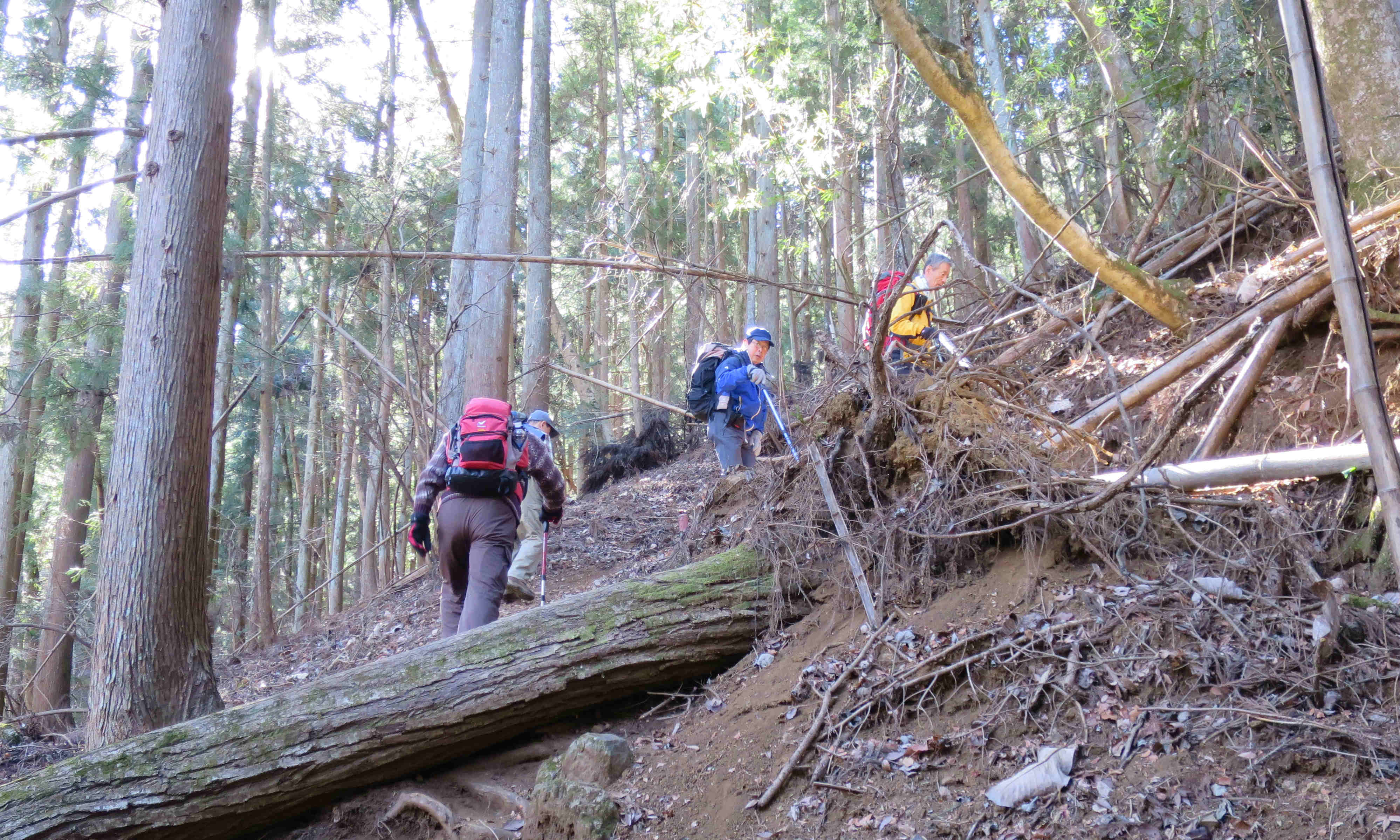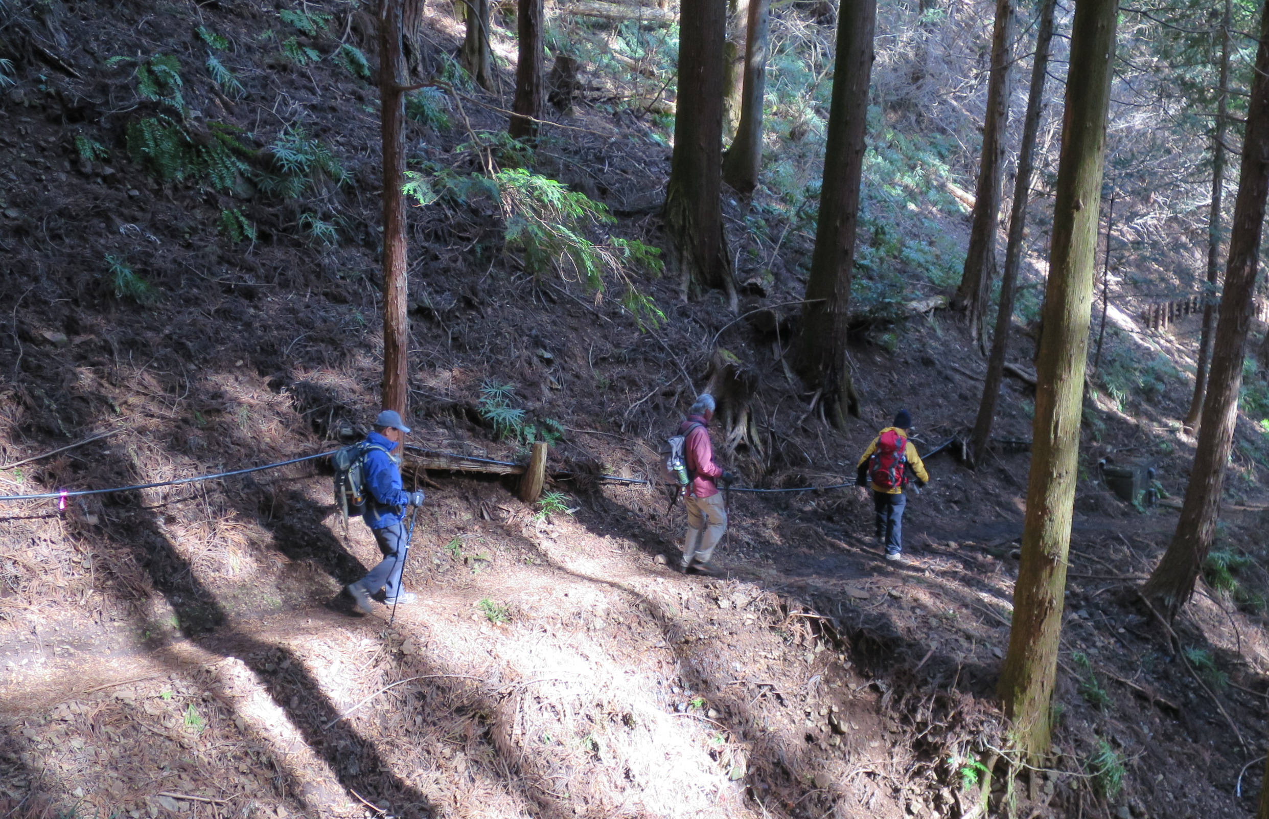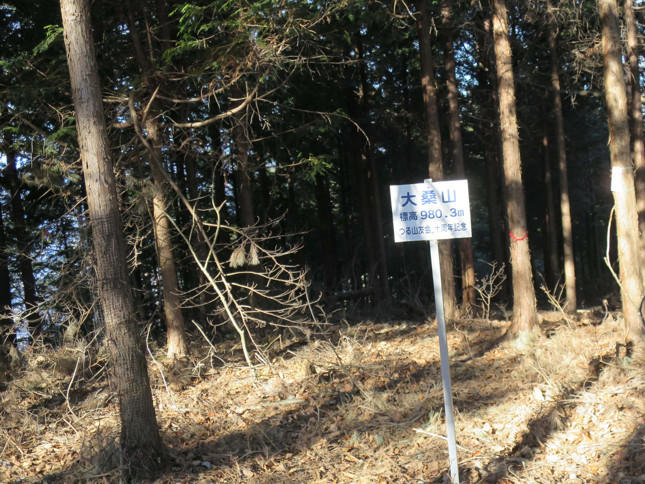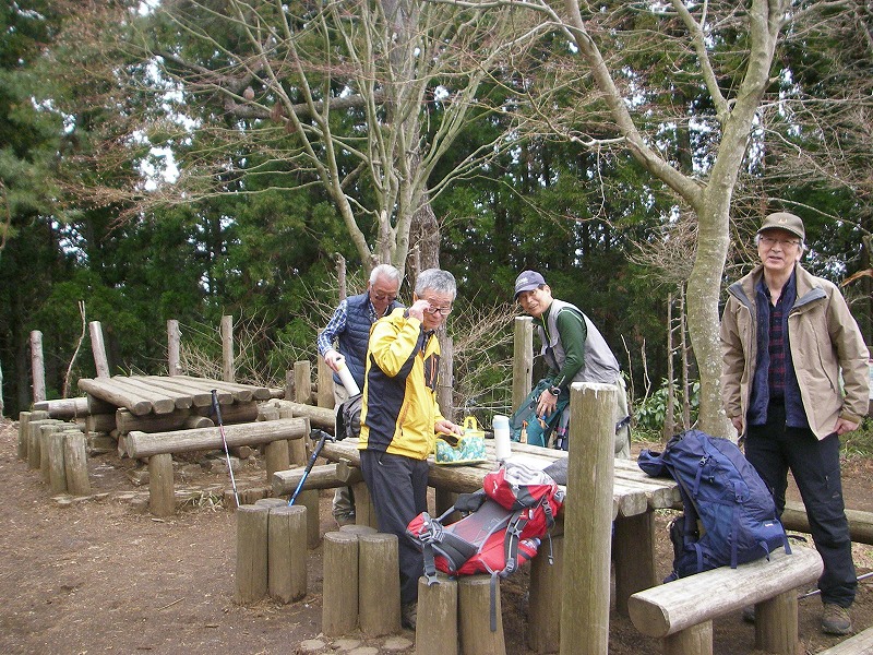 食事中の年配の方にお願いし証拠写真を撮り各自シートを広げ弁当を広げ昼食にした。1時間後次の目標の大桑山(980m)へ向う、急な下り坂を過ぎる危険感いっぱいの岩稜が行く手に待ち受ける1人ずつ慎重にわたり終えたらつづら折りの急坂の先に15:20大桑山山頂到着、猿橋駅に向けて下山は山崩れで多量の倒木を乗り越え長い林道を進むこと3時間、ようやく猿橋駅にたどり着いた。