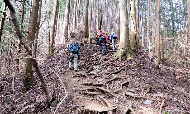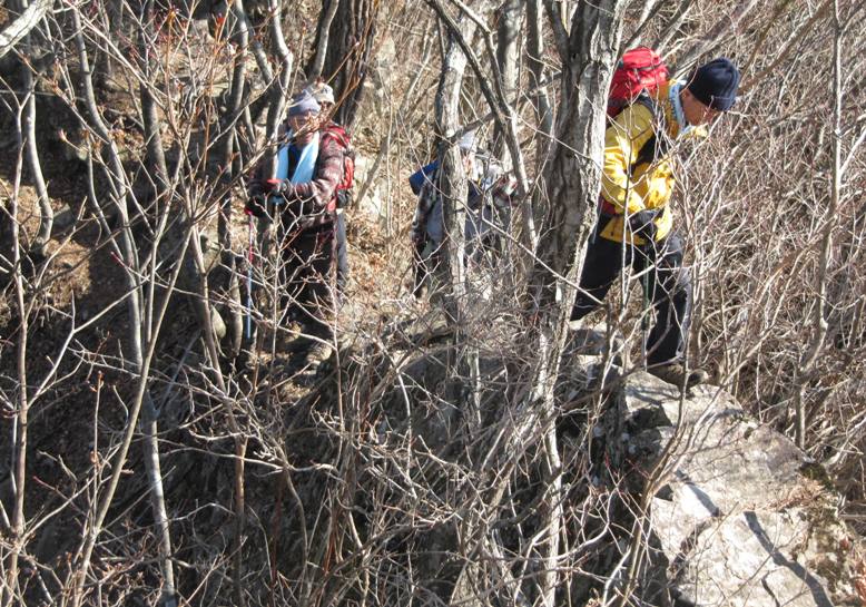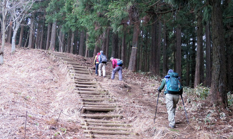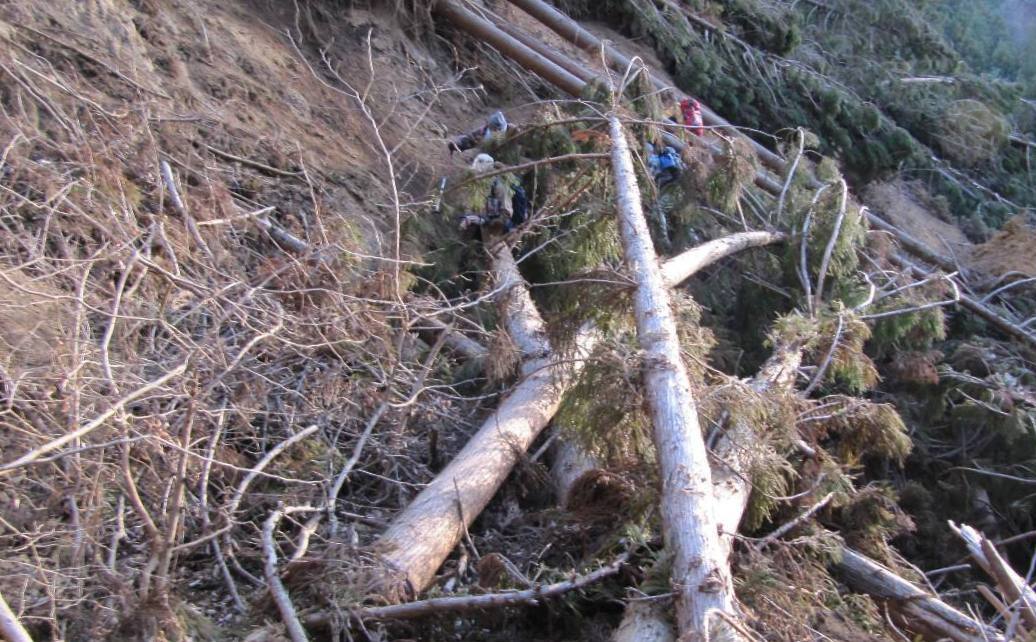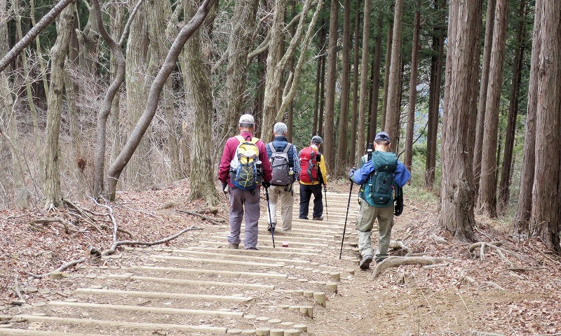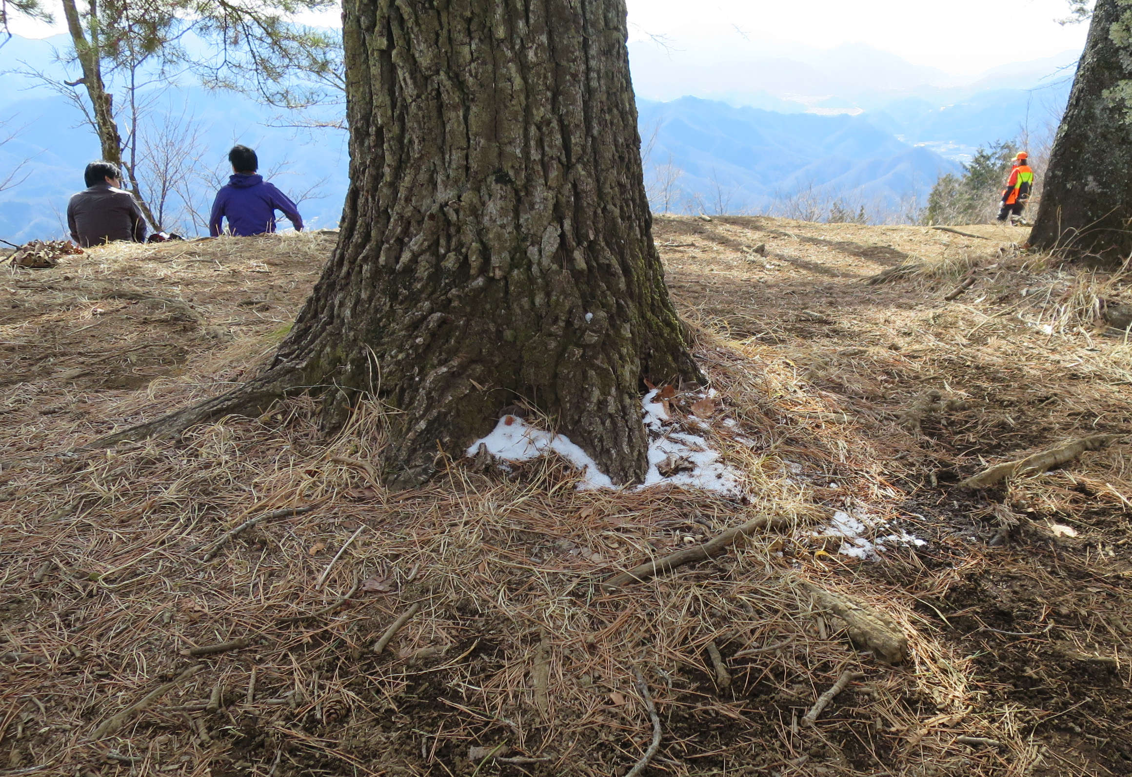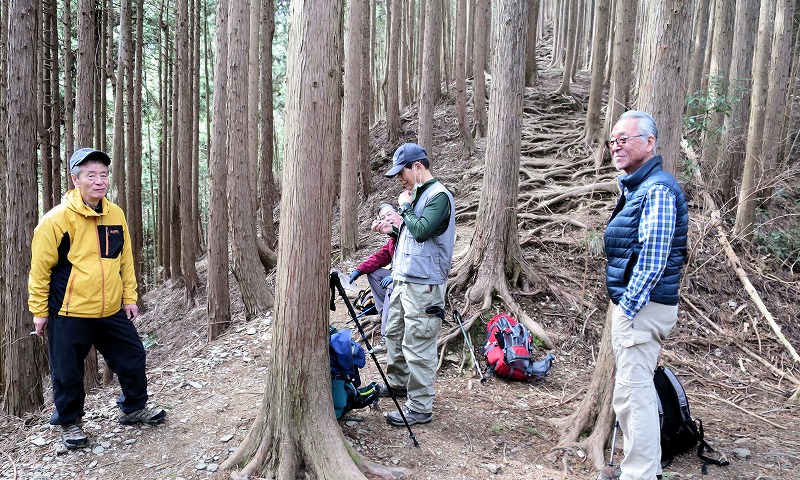 食事中の年配の方にお願いし証拠写真を撮り各自シートを広げ弁当を広げ昼食にした。1時間後次の目標の大桑山(980m)へ向う、急な下り坂を過ぎる危険感いっぱいの岩稜が行く手に待ち受ける1人ずつ慎重にわたり終えたらつづら折りの急坂の先に15:20大桑山山頂到着、猿橋駅に向けて下山は山崩れで多量の倒木を乗り越え長い林道を進むこと3時間、ようやく猿橋駅にたどり着いた。