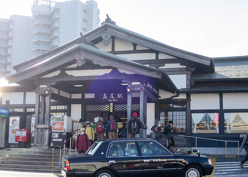 起点となるJR高尾駅前のバス停は訪れる人々で賑わっている。高尾駅に8時45分集合、参加者は、市川正(S41E)・嵯峨良平(S43E)・三浦勝(S43M)・乳井豊昭(中央高校)・奥山恍(S41K)の5人です。