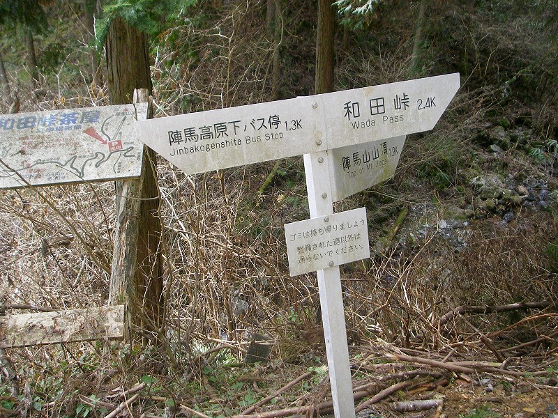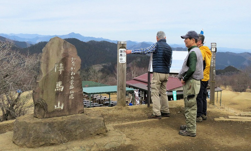 9時20分陣馬高原下に到着、和田峠に続く舗装道路を歩き20分程で着いた新道登山口から山頂を目指す、杉の根っこの多い登山道を息を切らせ途中3度の休憩をし、11時5分陣馬山山頂に到着、360度の景色が素晴らしい、雪化粧の富士山も雲の合間に望めた。