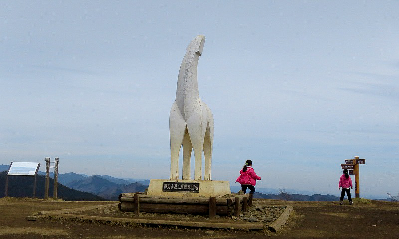 白馬の像の前で記念撮影後次の目標である景信山へ、15分で奈良子峠を通過、ほぼ平坦な尾根道を快調に進み11:50分明王峠の茶屋に着く、営業はしていない、幸いテーブル席が空いていたので昼食休憩、南側の眼下に相模湖を始め今までに登った山々が望めた。