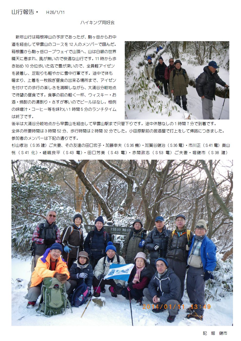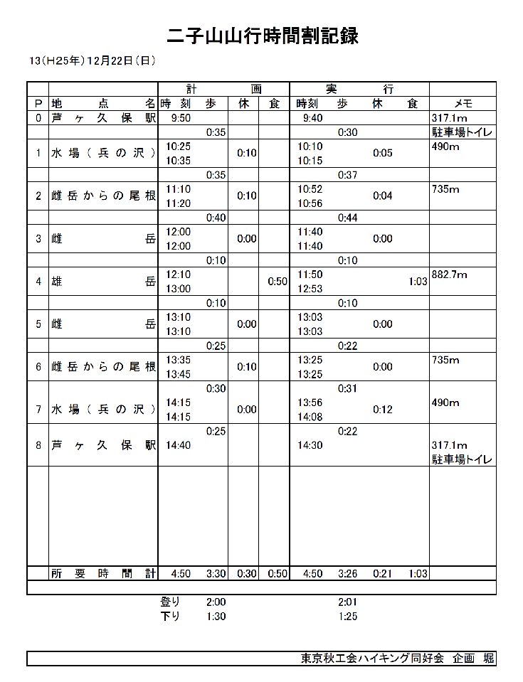 各々持ってきたお弁当に加えて焼酎のお湯割り・味噌汁・コーヒー等をいただき和気藹々で約1時間の昼休みののち下山、積雪の下りで何人かすべって尻餅をつきながらも快調に、計画どおりの時間で今年の忘年山行を終え新年の箱根での再会を約束し解散。