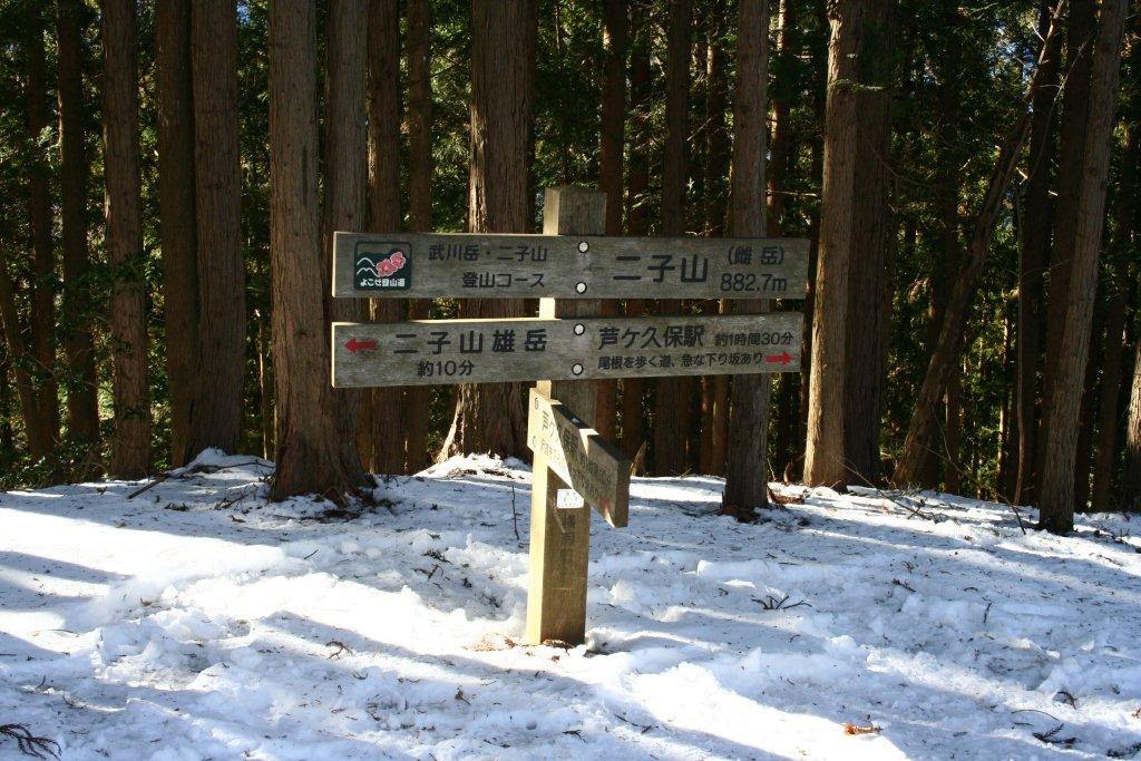 歩行30分で水場に到着5分間の休憩で沢と杉木立の登山道を登る事1時間で雌岳882.7mに到着、標識に雄岳まで10分とあったのでここは休まず雄岳に向かう、本当に10分かと半信半疑で途中出逢った2人組に聞いたところ10分との返事が返ってきた。しかし、この後少し下ったらすぐにけっこう雪の積もった急勾配をロープの助けを借りて山頂に到着、昼ごはんの場所を確保する。