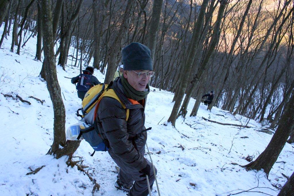 この日は雲ひとつない快晴に恵まれ絶好のハイキング日和もかなりの寒さ、駅からすぐの登山口からいきなりの急坂を20分程登ったらたちまち体が温まり小休止と上着を1枚脱ぐメンバーも数人、この山は880mほどのあまり高い山ではないが登り始めは結構な急勾配であった。