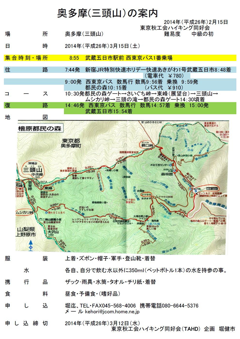さて3月の山行は15日(土)奥多摩三山の一峰、三頭山です。
