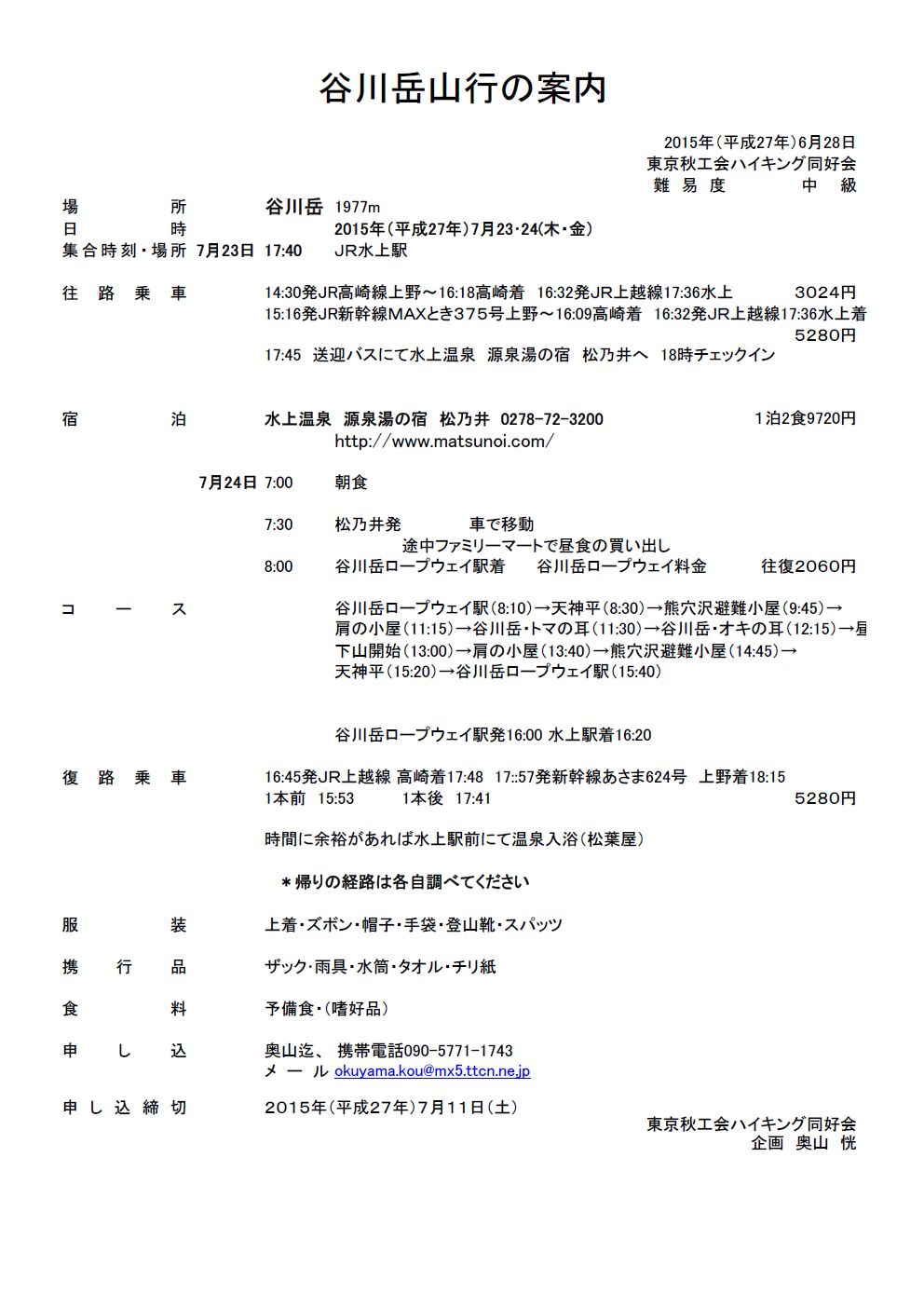 平成12年8月1日にも10人の参加で谷川岳に登り、この宿に前泊している。部屋数の多さと2か所の露天風呂のほか大小の風呂を有し夏休み期間中は、学生の団体がかなりあるとの事。夕朝食はバイキングスタイルで食べ放題であるが、年のせいか思うようには食べられなかった(残念)。
