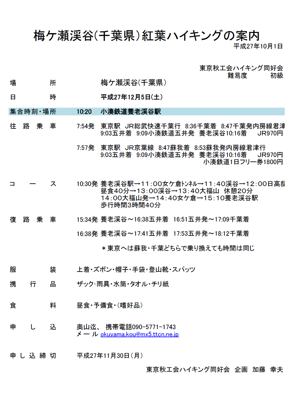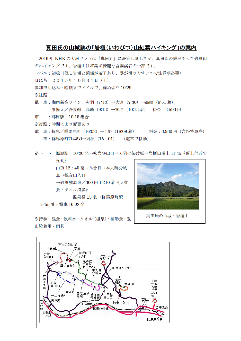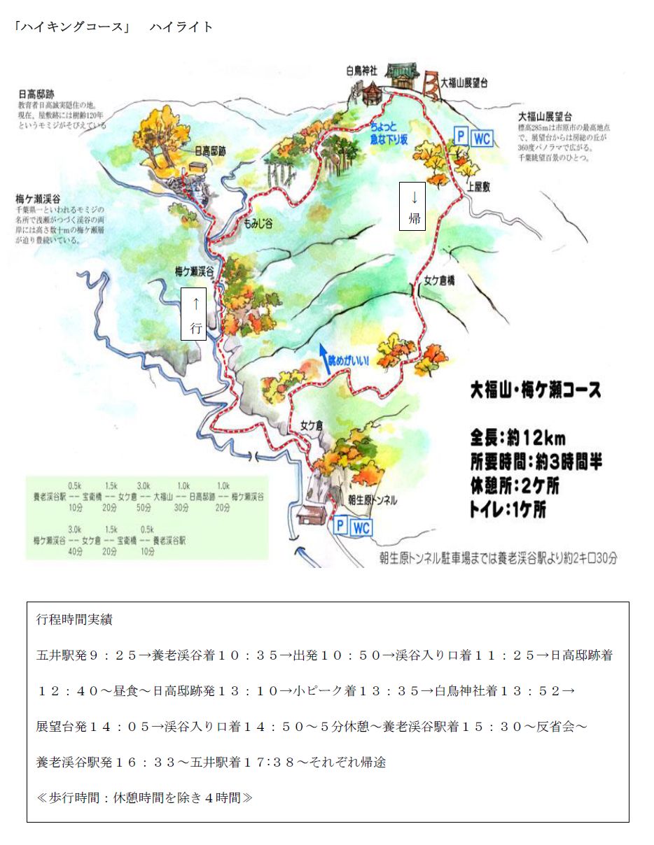 11月のハイキングは、当初計画通り一日前倒しで10月31日(土)に決行します。