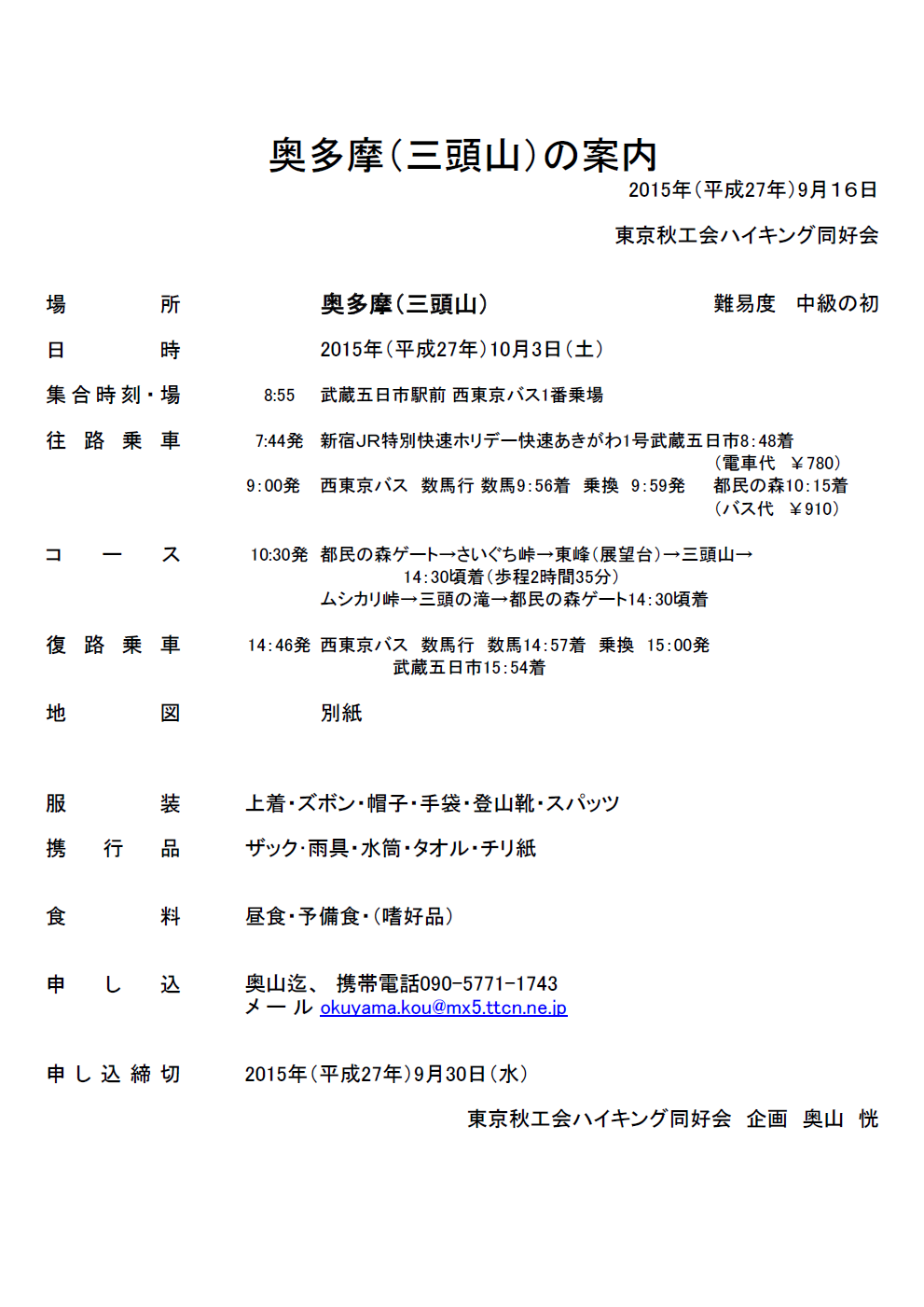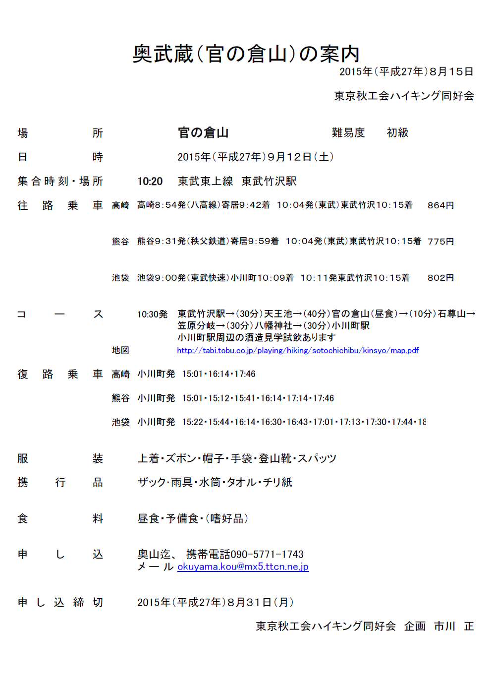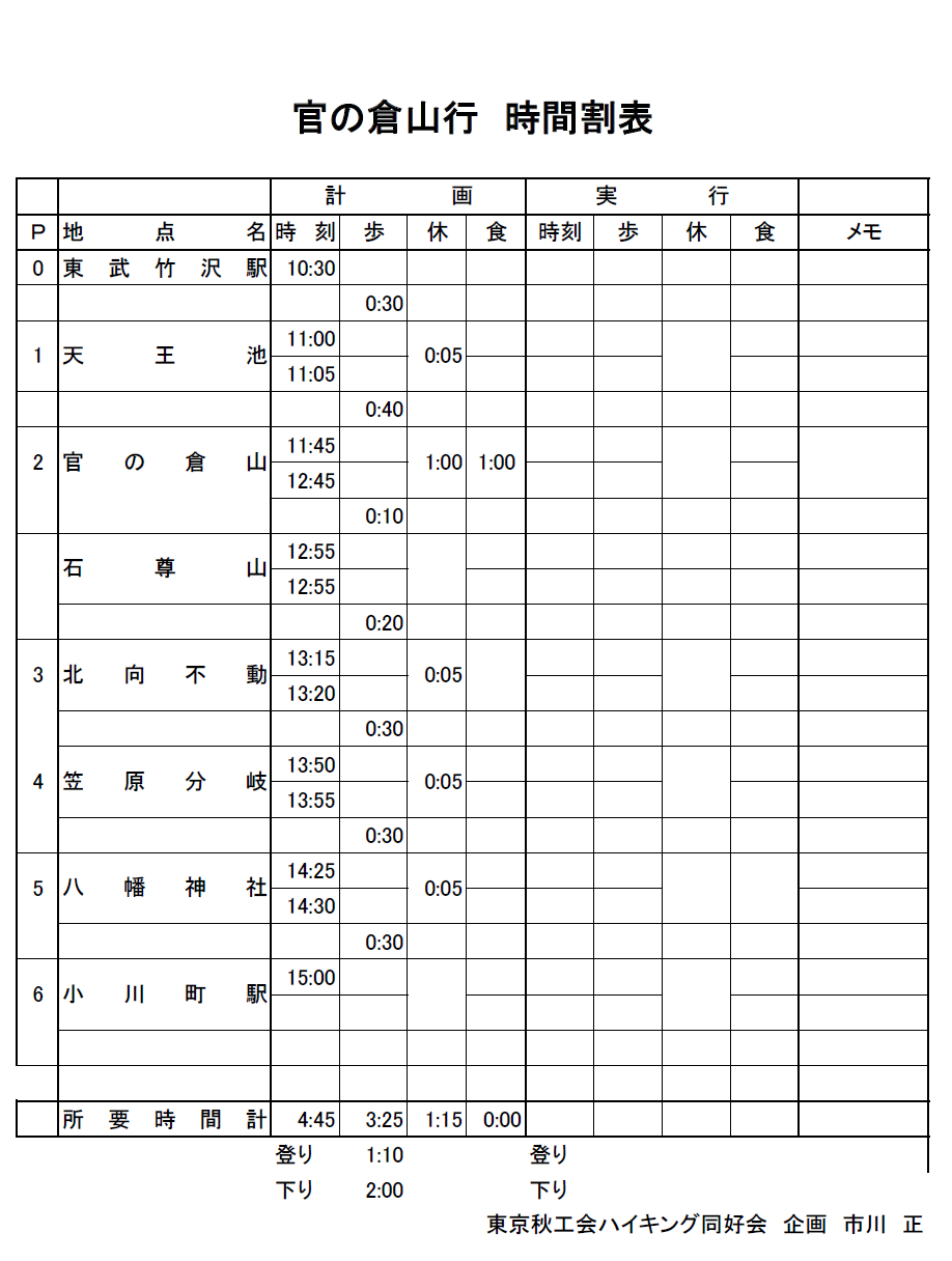 11月のハイキングは、当初計画通り一日前倒しで10月31日(土)に決行します。
