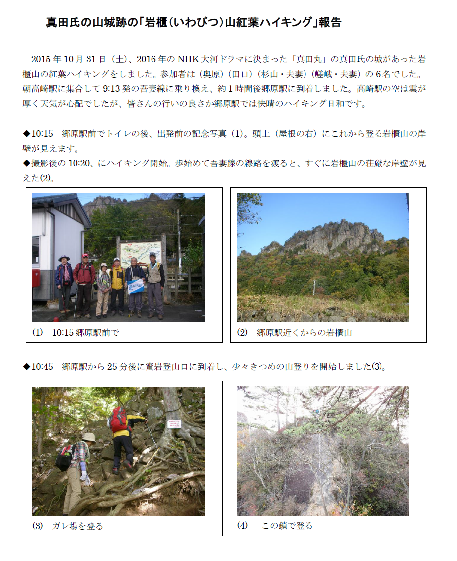 平成27年10月31日群馬県東吾妻町の岩櫃山に、杉山孝治(S38A)夫妻・嵯峨良平(S43E)夫妻・田口芳美・奥山恍の6名で挑みました。