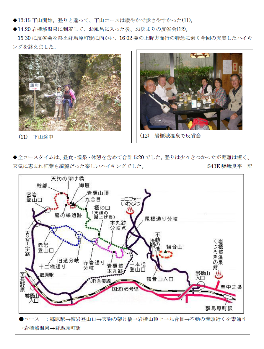 予定より30分遅れていたので下山はハイピッチで第2の目的地岩櫃温泉に14時20分に到着約1時間の入浴・ビールを楽しみ、予定の特急電車に乗ることができた。天候にも恵まれ、バラエティーに富んだ印象に残る山行でした。