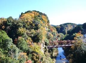 約70分乗車して養老渓谷駅着、駅前は大混雑状態、用を済ませ10時50分に駅前を出発、しばらくは舗装道路を所々の紅葉を眺めながら歩くこと30分で梅ケ瀬渓谷入り口に到着し、5分程休憩していよいよ渓谷歩きの開始です。