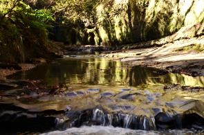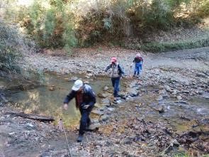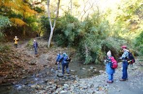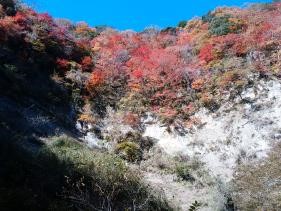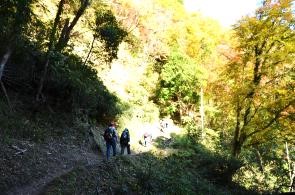 徒歩の途中には崖の上の随所に紅葉が見られ立ち止まって鑑賞、道はいつの間にか谷間に入り川沿いに徒歩、また何度も飛び石伝いに川を横断しながら進む。途中で崖上を見上げれば見事な紅葉が見られ飽きない。大福山への分岐点を右に見て5分ほどで日高邸跡に12時40分到着、75分の渓谷歩行。