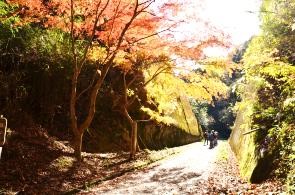 紅葉の切り通しを行く