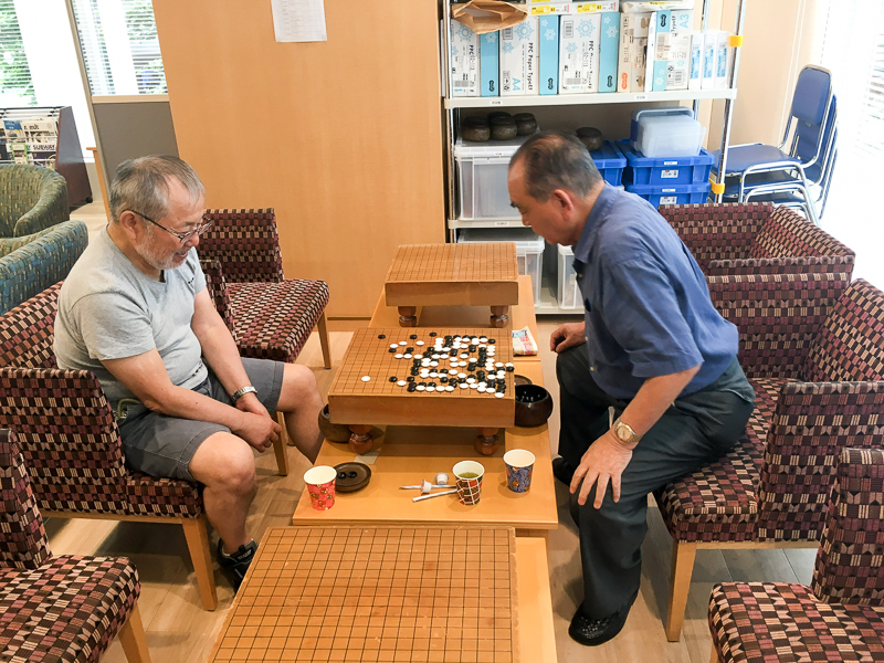 連日の猛暑の中、この日は最高気温も少し低めとなりましたが、戸外を歩くと汗が滴り落ちます。エアコンの効いた室内のソファでくつろいながら盤上では熱戦が繰り広げられました。