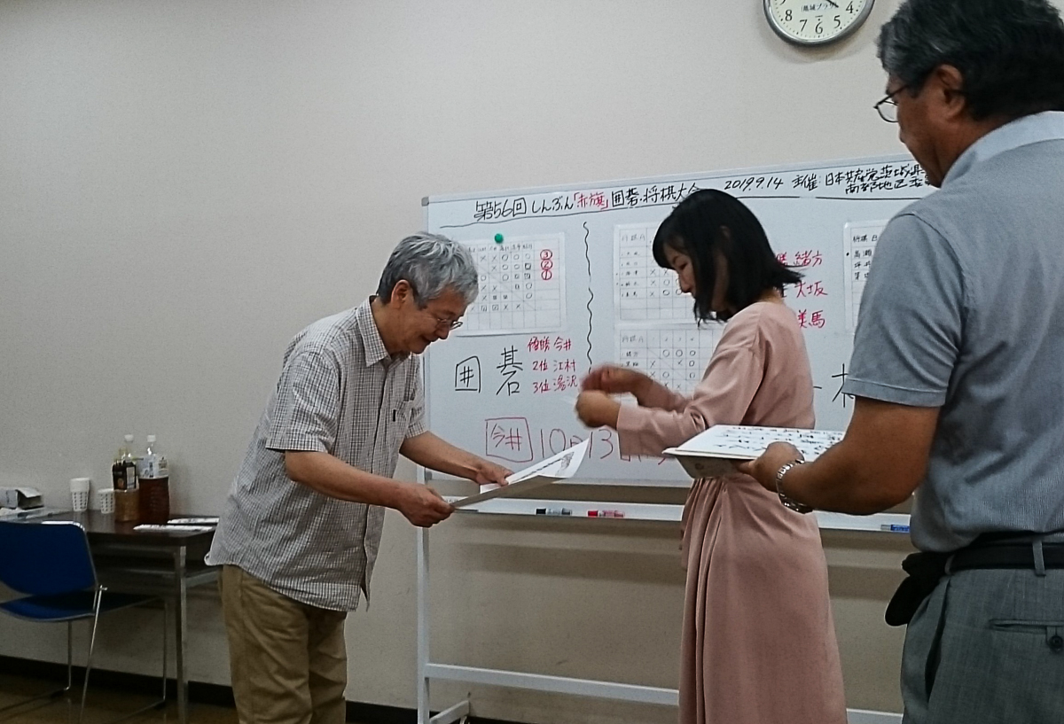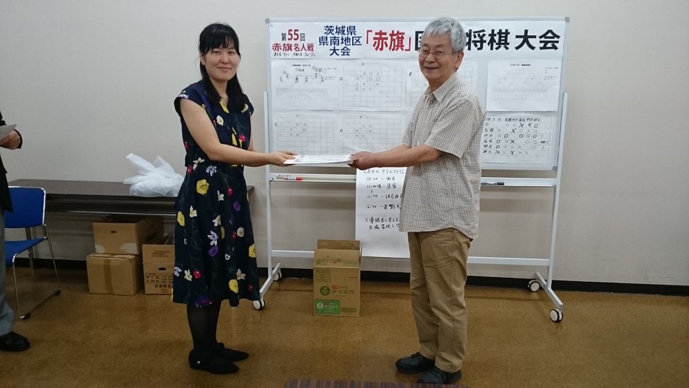 今年9月、しんぶん赤旗名人戦の茨城県地区予選で優勝した今井さん。茨城県出身の日本棋院 加藤啓子六段より賞状授与。(写真提供:今井さん)