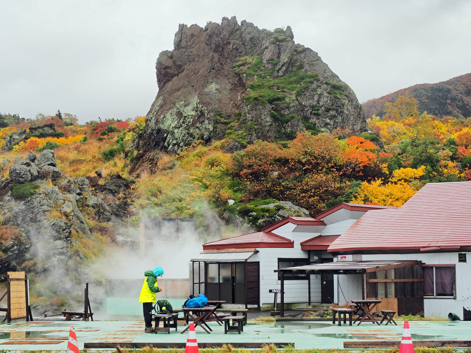 暫くして硫黄の臭いが立ち込め、霧の中に建物が見えて須川高原温泉に13時過ぎに到着した。