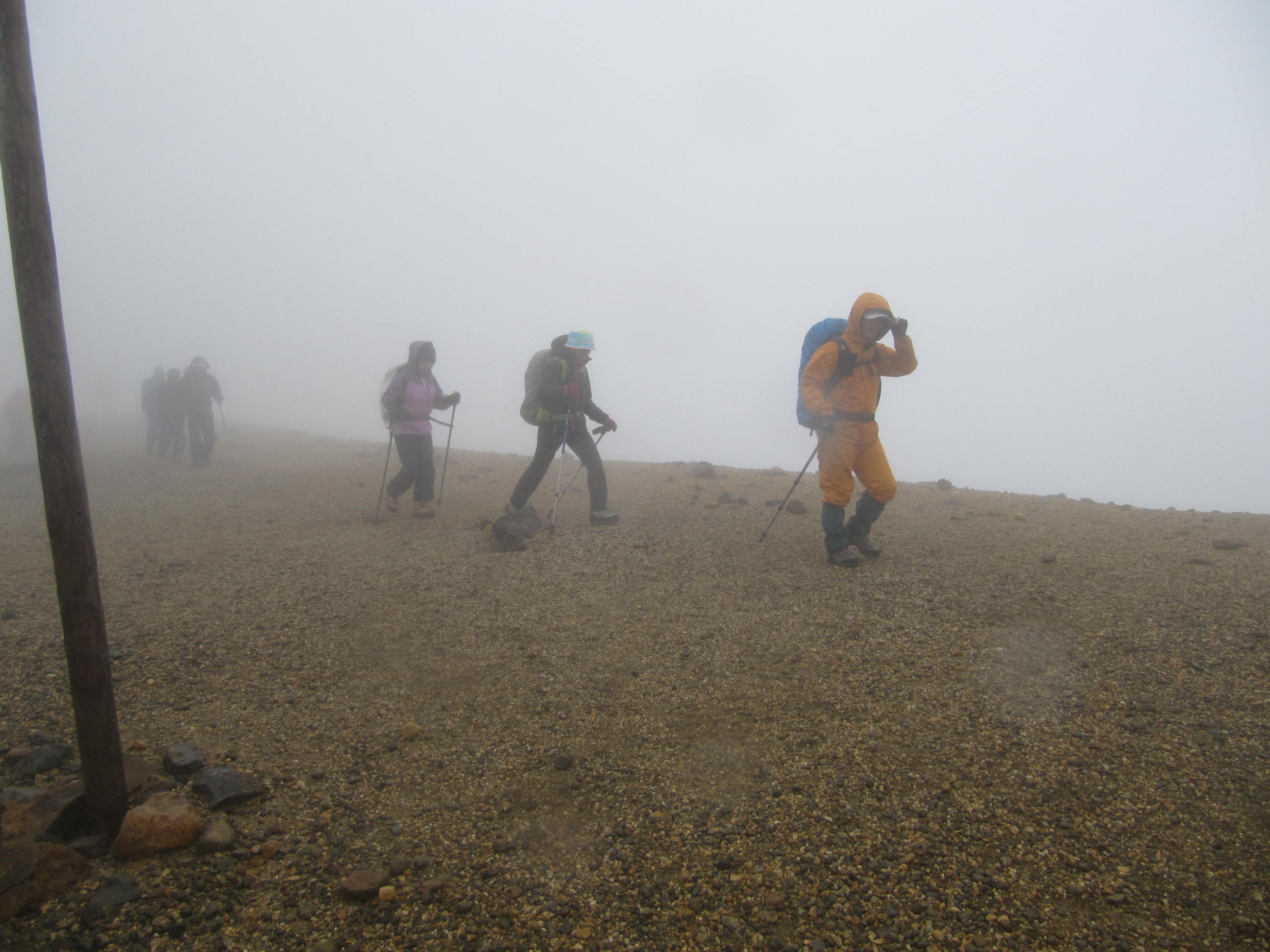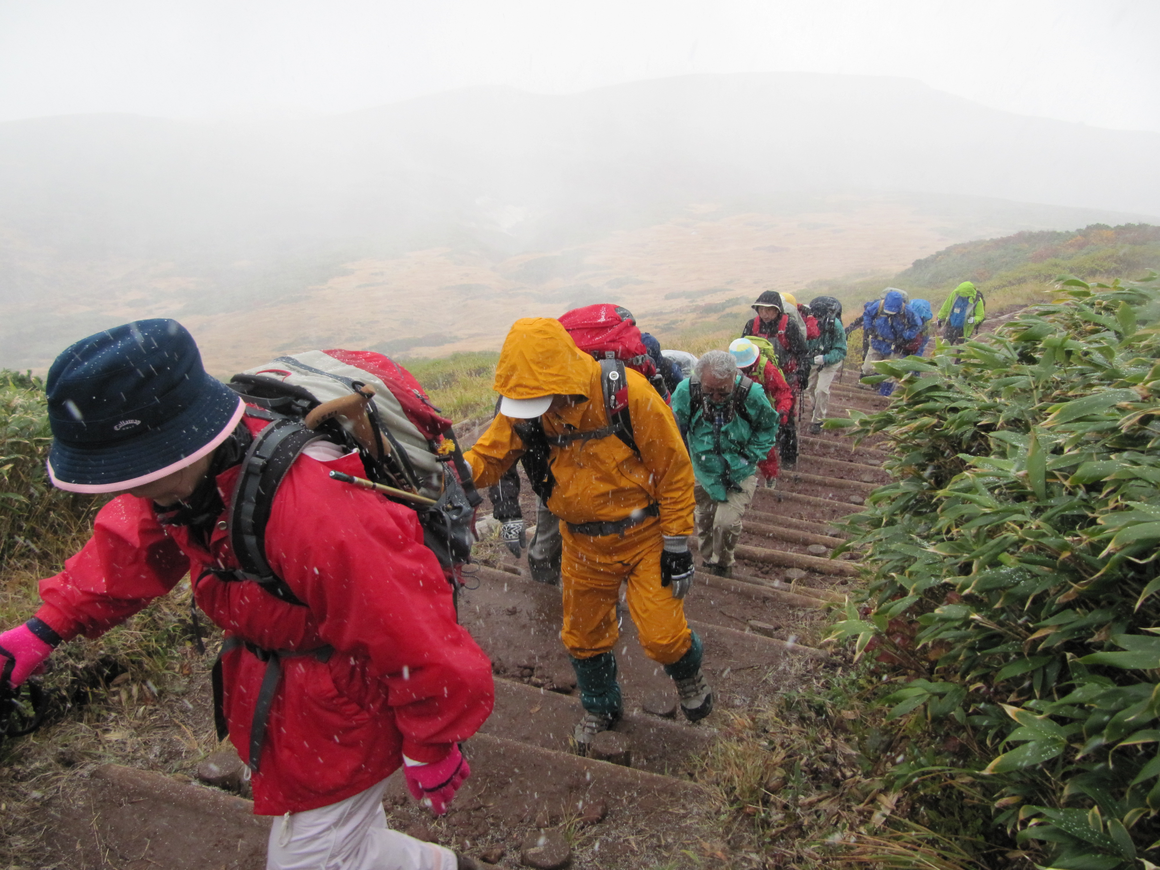 樹林を抜けて見晴らしの良い場所に出るが、ここから天候が急変し、強風とあられに見舞われ急激に寒くなる。丸太階段を登って栗駒山頂上へ10時25分に到着、強風と低温、あられ雪の為写真だけ撮り早々に下山する。