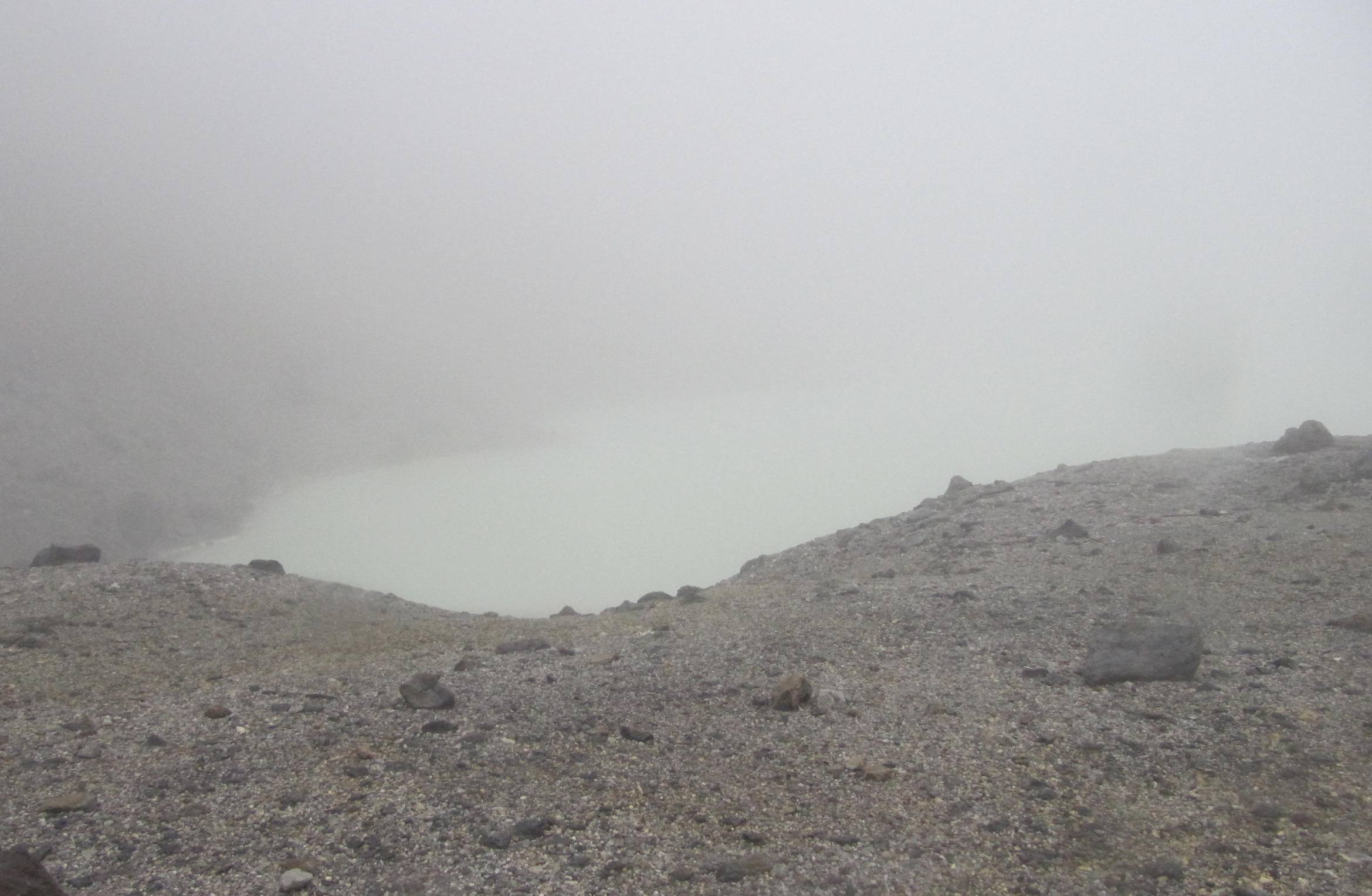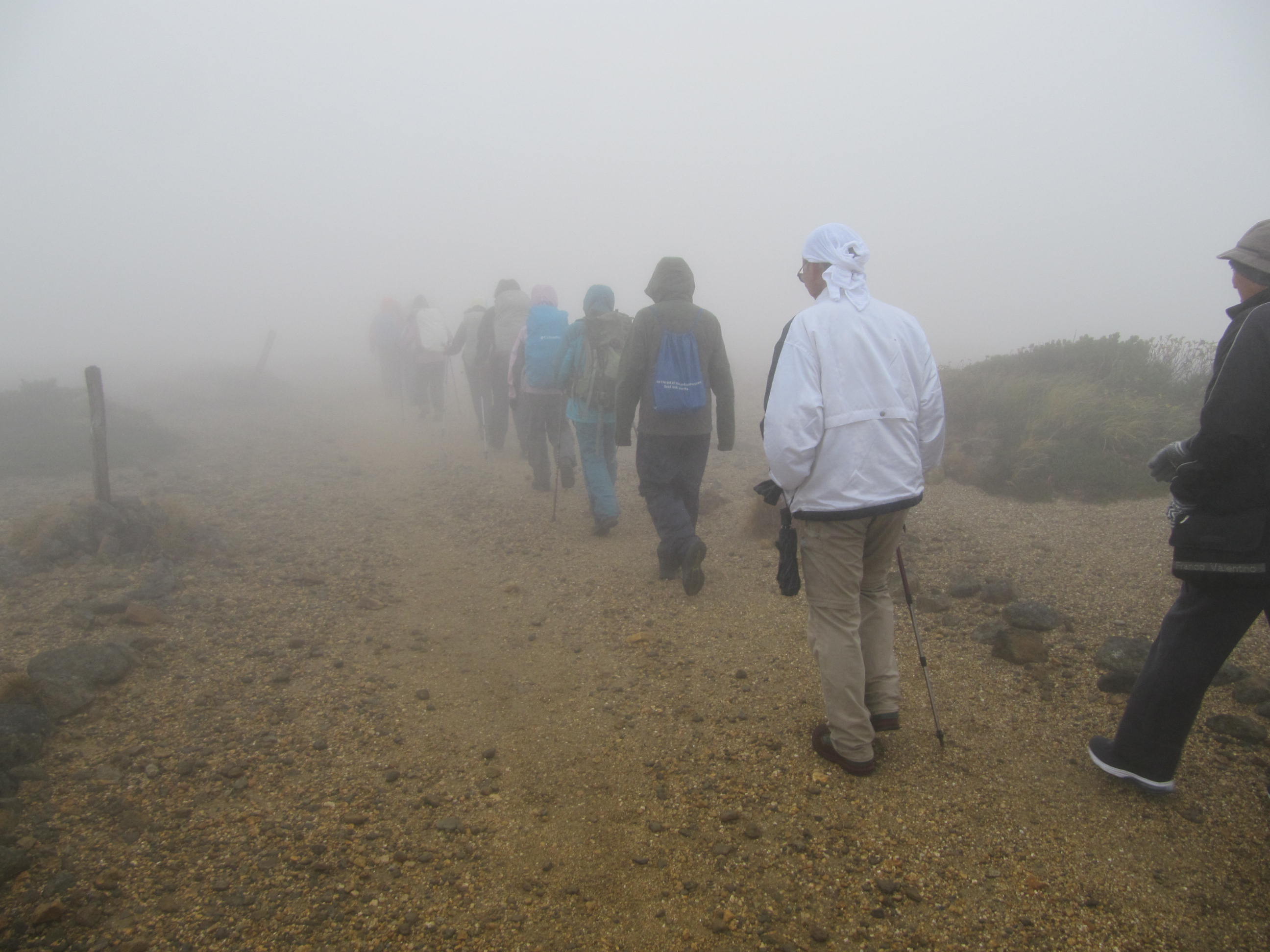 ここからは歩行終着地の須川高原温泉まで雨、風、ぐちゃぐちゃ道の連続で苦闘しながら、ひたすら下を向いて歩くことになった。天狗平(須川分岐)を通過、昭和湖に11時45分に到着、昭和湖のほんの一部が見られた。
