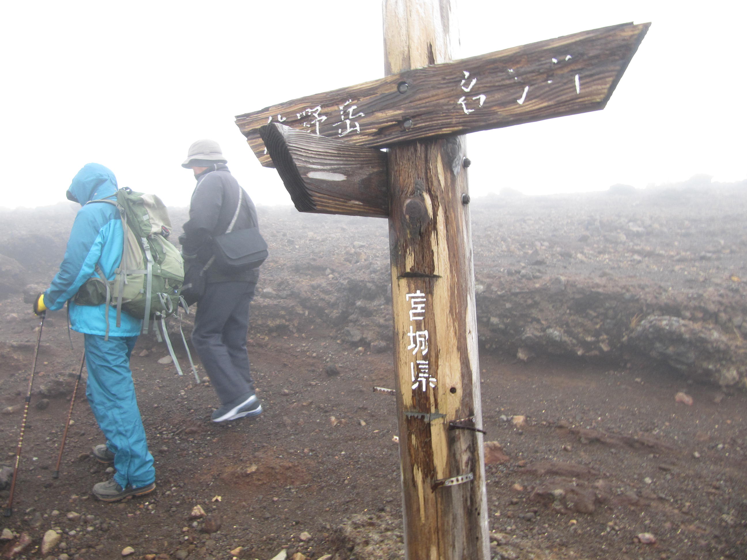 天候は既に雨模様でガスの為、御釜(火山湖)は全く見ることができない。熊野岳避難小屋で小休止し熊野岳(蔵王山)1840.5mに到着、記念写真を撮り駐車場ハウスへ戻る。13時35分に帰着。明日の足慣らし程度であった。