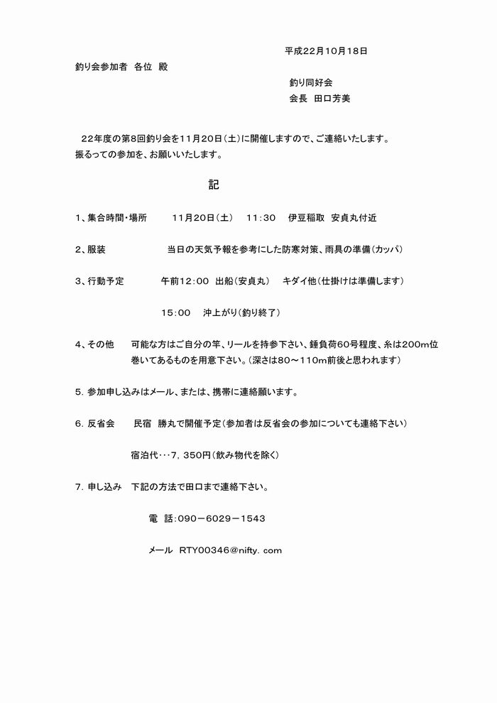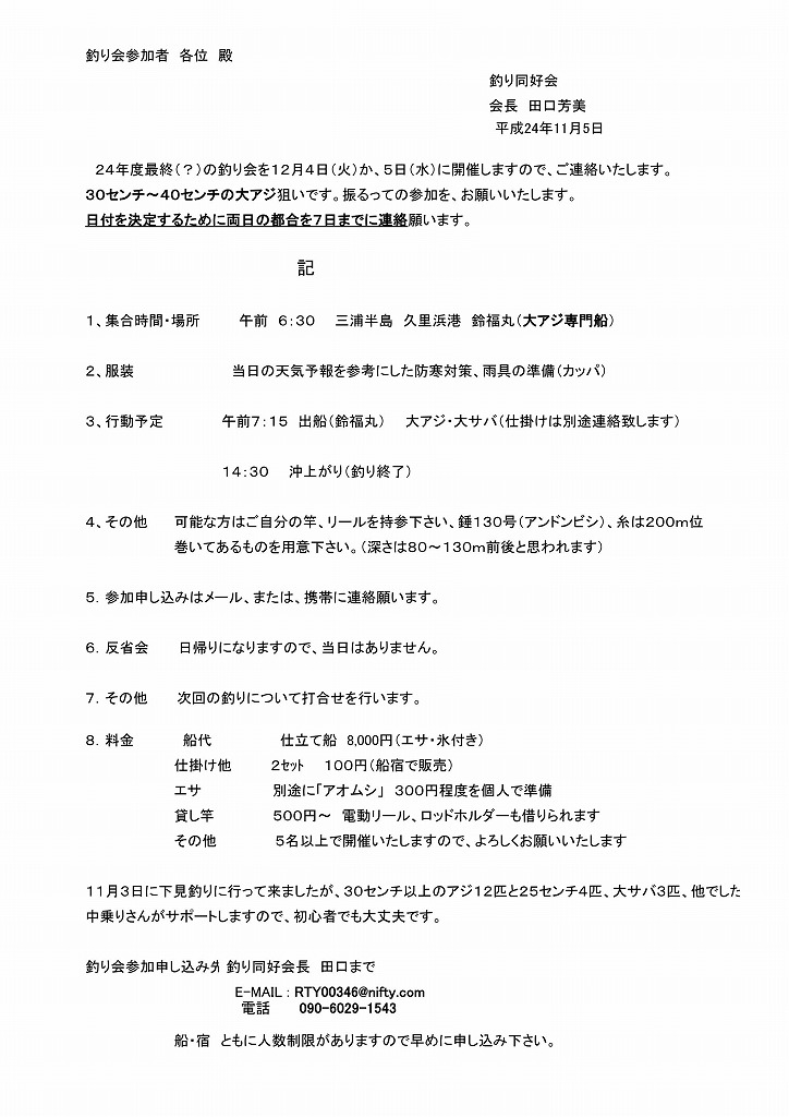 釣り会参加申し込み先 釣り同好会長 田口まで