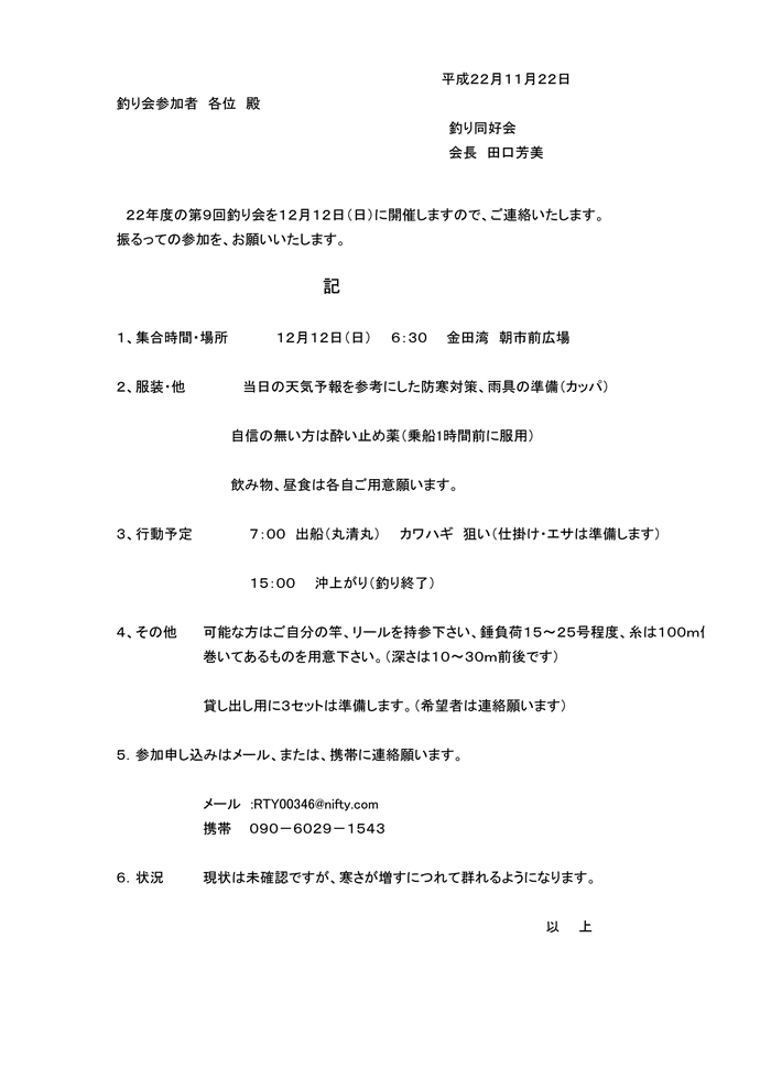 釣り会参加者 各位 殿