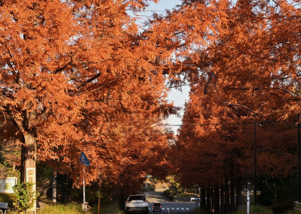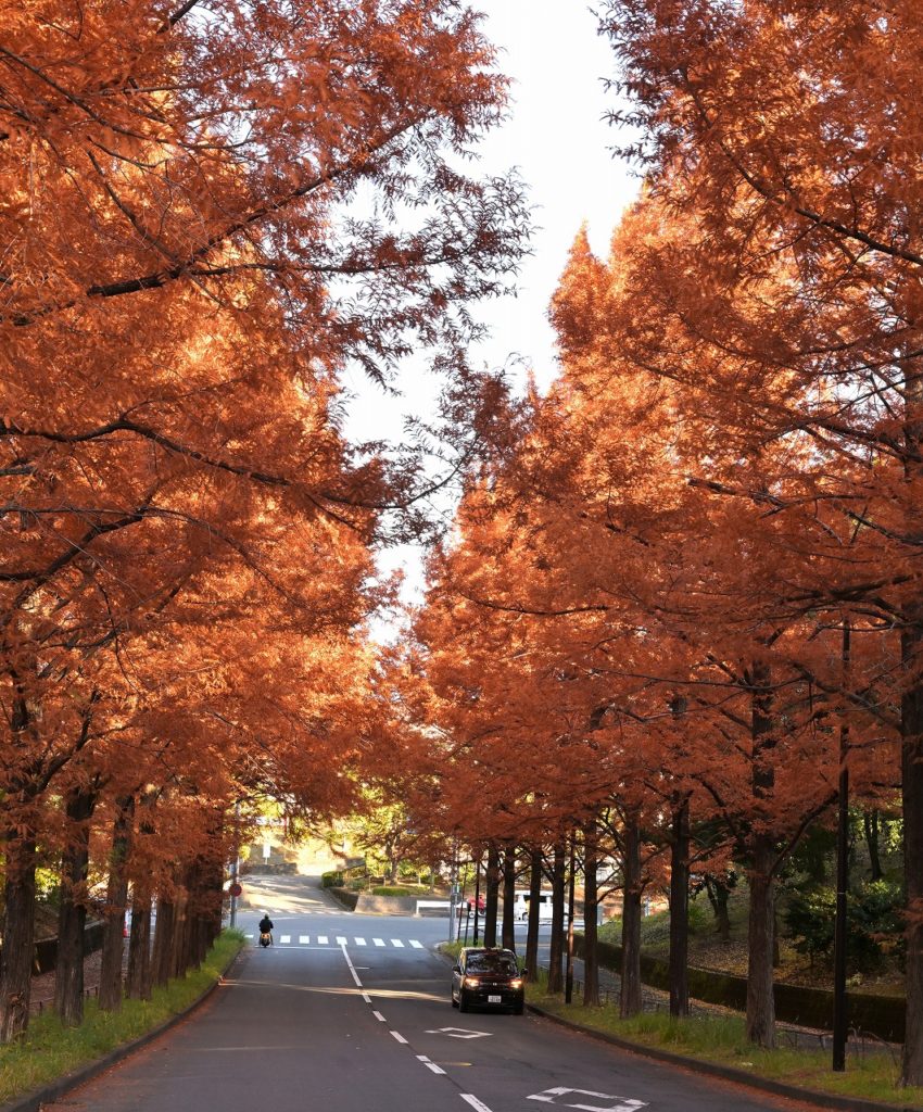 26日多摩市のメタセコイア通り鶴牧の団地(故加賀谷宅テラスハウス)前の歩道橋から並木道「メタセコイア通り」を眺めると順光を浴びたオレンジ色が鮮やかで、暖かさを感じた。