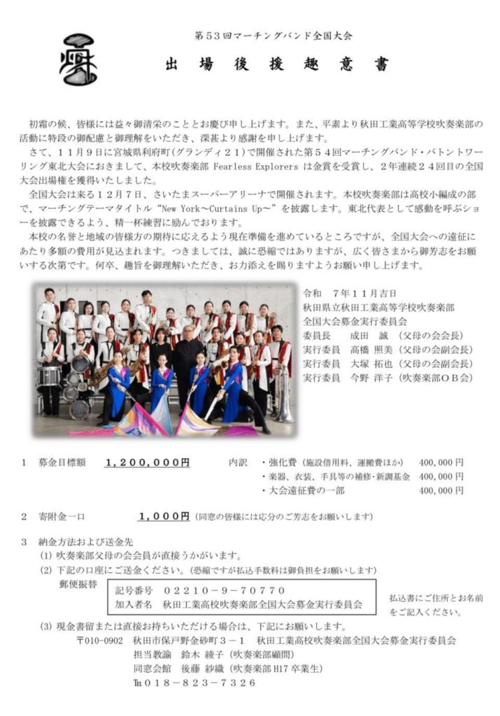 秋工ラグビー・マーチング全国大会出場募金のお願い
