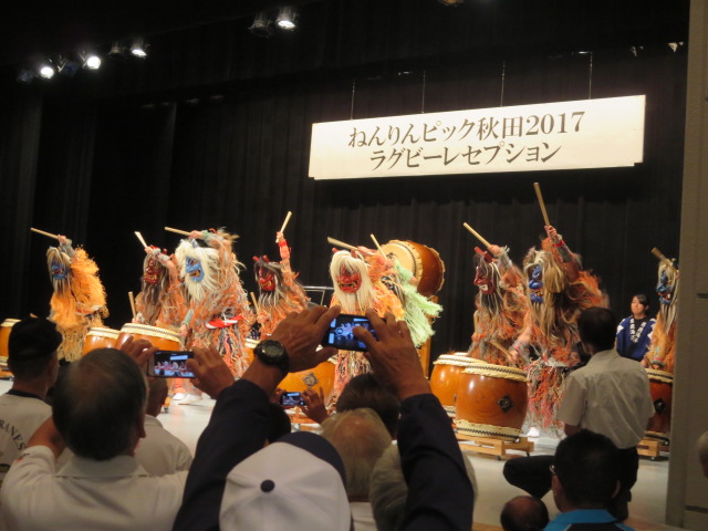 ラグビーの交流試合は男鹿市で9月10日(日)から始まり11日(月)で終了しました。初日の交流試合後、16:00~19:00まで男鹿文化会館で、レセプションが行われました。 全国往年ラガー達の友情の場に変わりました。 サントリー酒類(株)秋田支店ではサントリーモルツの生ビールを提供又、高清水では冷酒を提供して全国のラガーは美味しいビールと秋田のお酒を堪能していました。