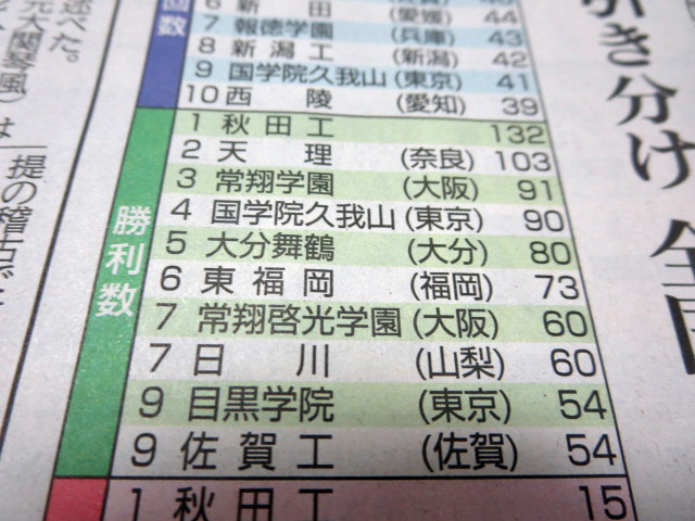 ただ秋工は第67回大会(87年度)を最後に頂点から遠ざかっている。その後30大会は常翔学園、常翔啓光学園、東海大仰星の大阪勢が計15回、東福岡が5度制している。(すべて私立高校である) ラクビーは15人という多人数で戦う競技だけに、少子化が進む中、選手の確保は難しくなっている。それでも今大会の王者東海大仰星に負けなかった。秋工はさらに奮起して花園で活躍してもらいたい。