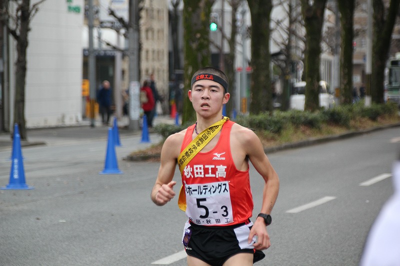 秋田県代表で、6年連続24度目出場の秋田工は1区で45位と出遅れたが後半に巻き返し、2時間9分4秒で28位。 3区の竹村拓真選手(主将3年)は全力で追い上げ10人抜きの快走をした。