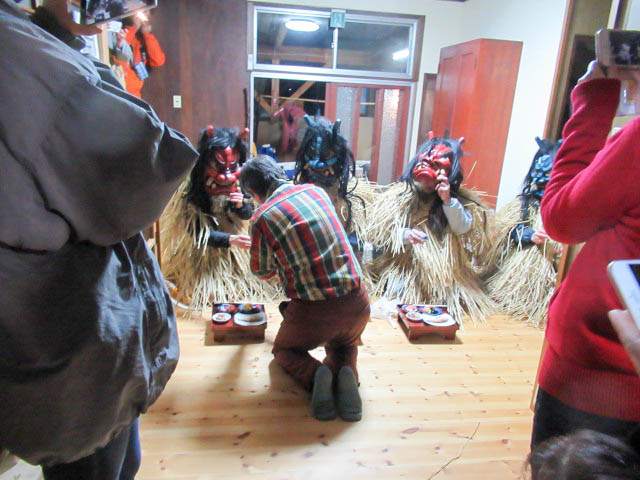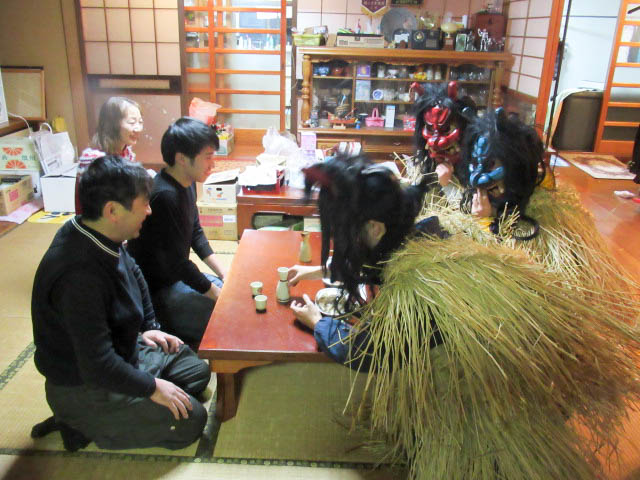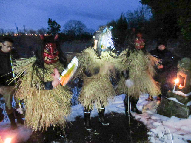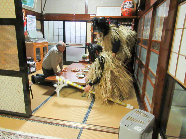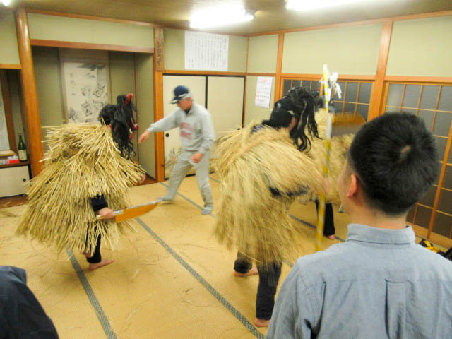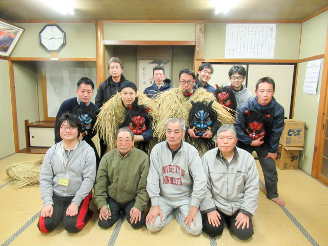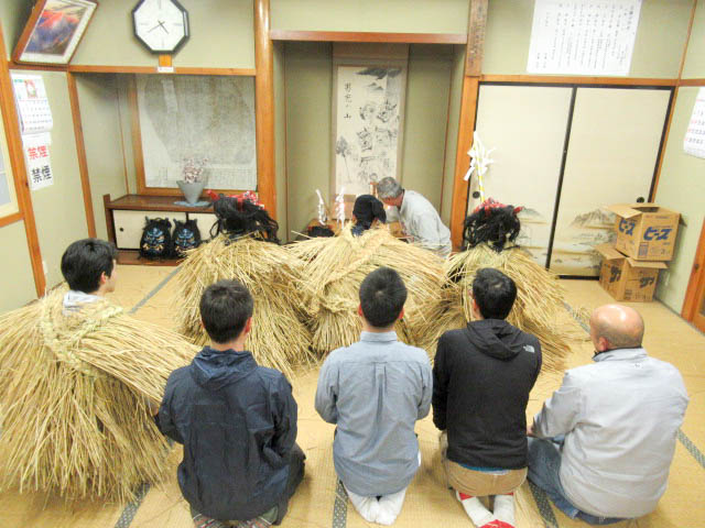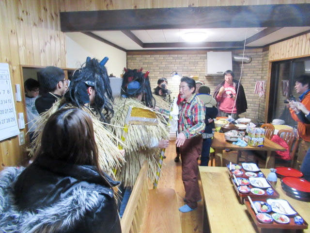 地区の高齢者とともに、秋田大学で学ぶ学生や、地区外(岡山、東京、秋田市、札幌)から来た男性らが角や牙を生やした 異形の面をかぶって家々を回り、無病息災や豊作、豊漁などを祈った。