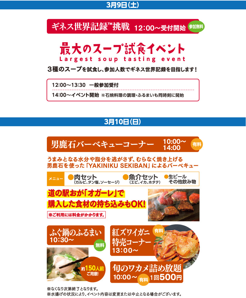 スープ試食世界記録挑戦イベントのほか、男鹿石バーベキューコーナーやふぐ鍋のふるまい、 紅ズワイガニ(3月から漁再開)特売、旬のワカメ詰め放題、男鹿のグルメ屋台コーナーも。