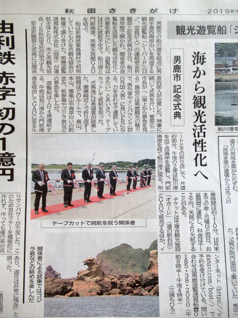 観光活性化に決意を新たにした。船川港と門前漁港、男鹿水族館GAOをむすぶ。 式典後には試乗して潮瀬崎付近で折り返すルートで、真山、本山、寒風山や海岸の街並み、帆掛け島、ゴジラ岩などの景色を 楽しんだ。